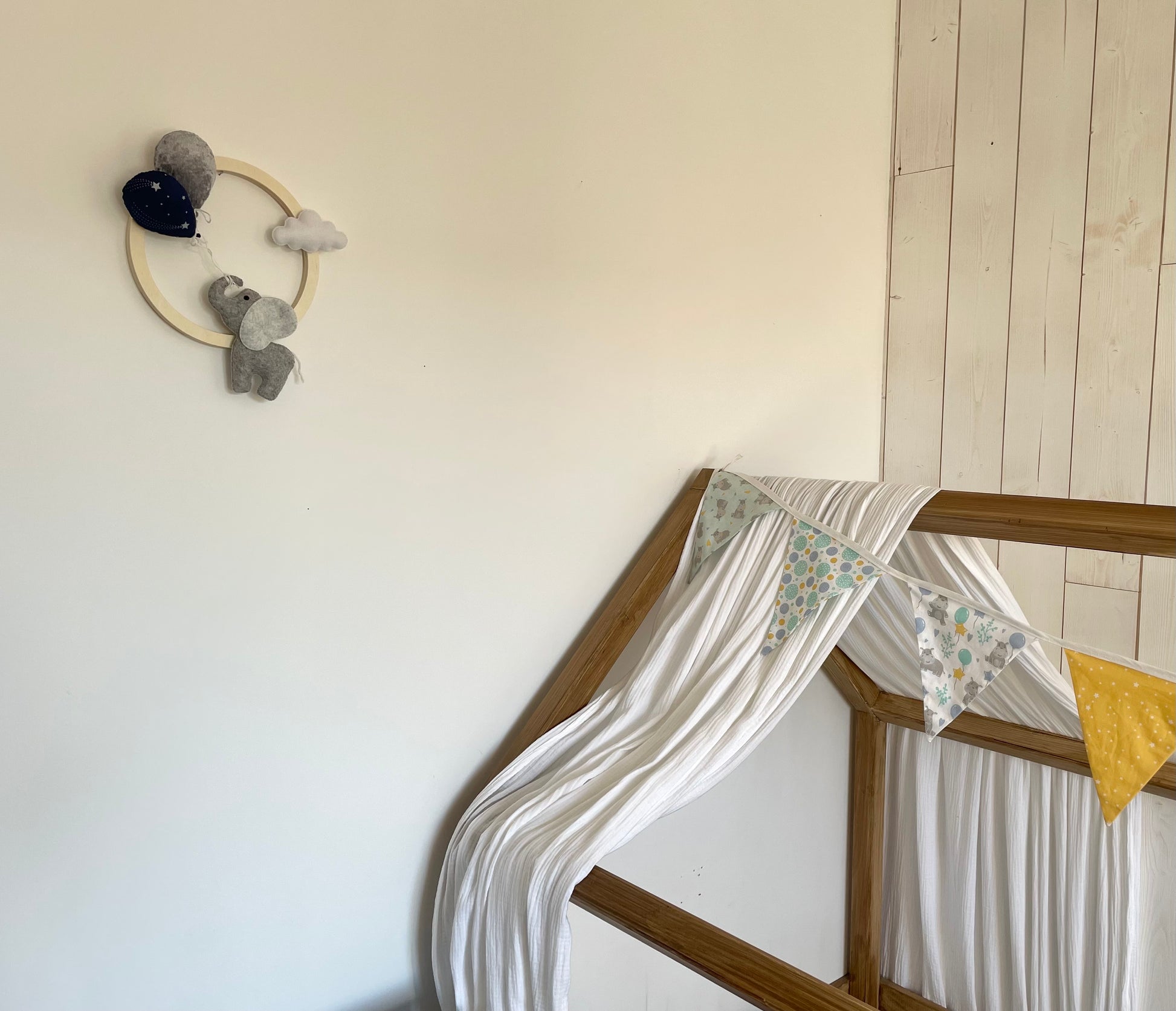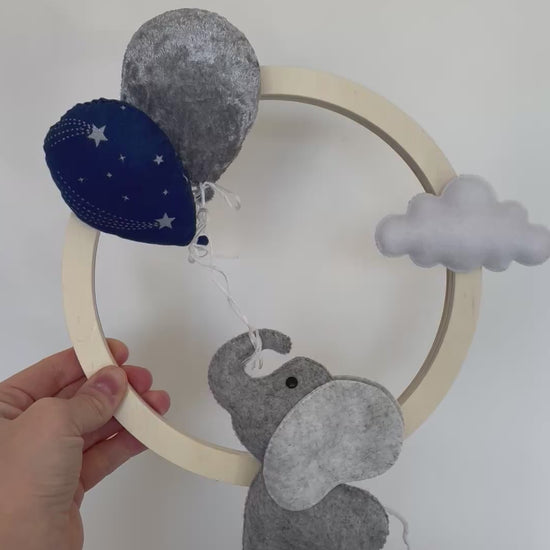 Éléphant et nuage en feutrine et ballons en tissu coton et velours.