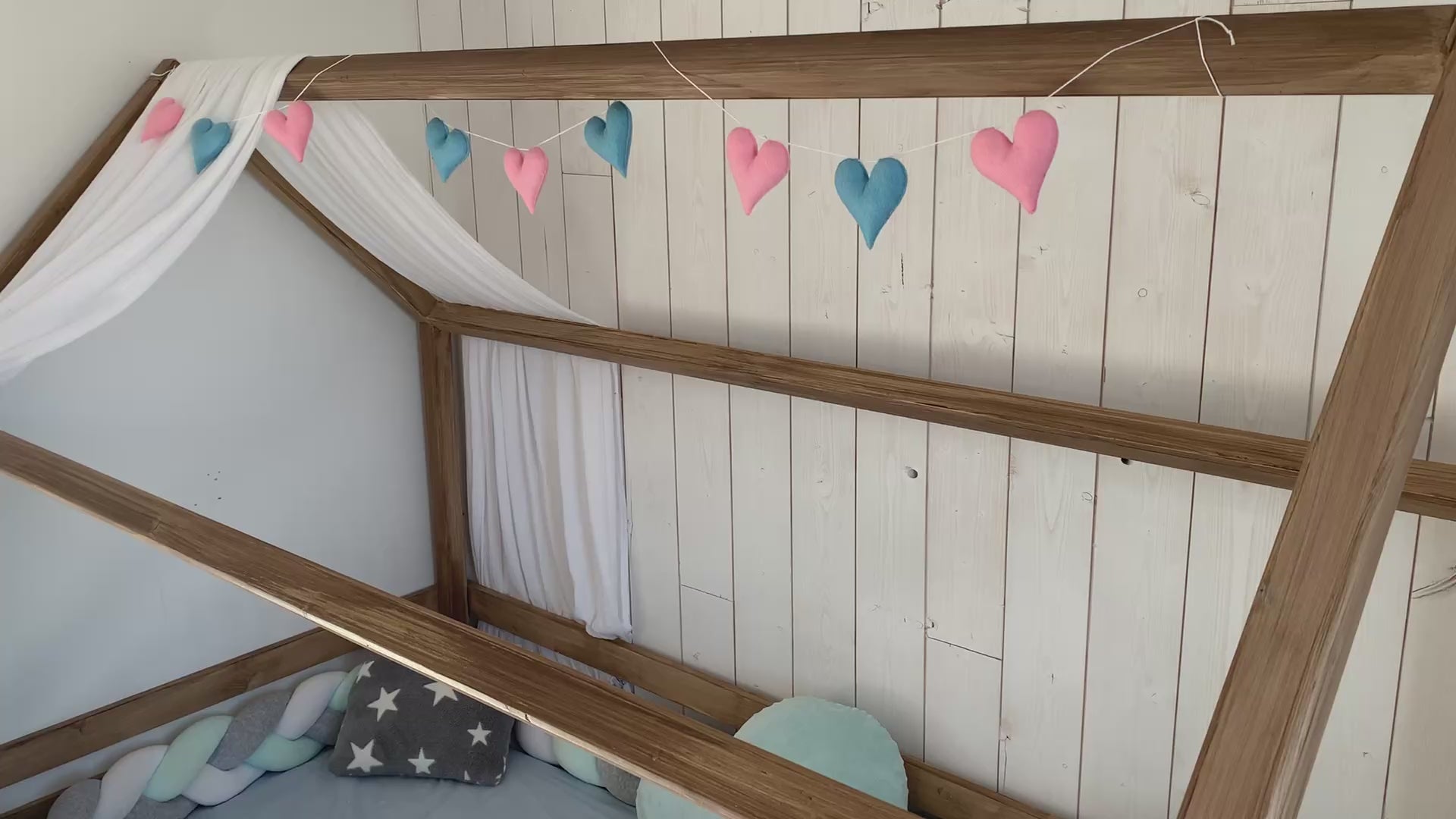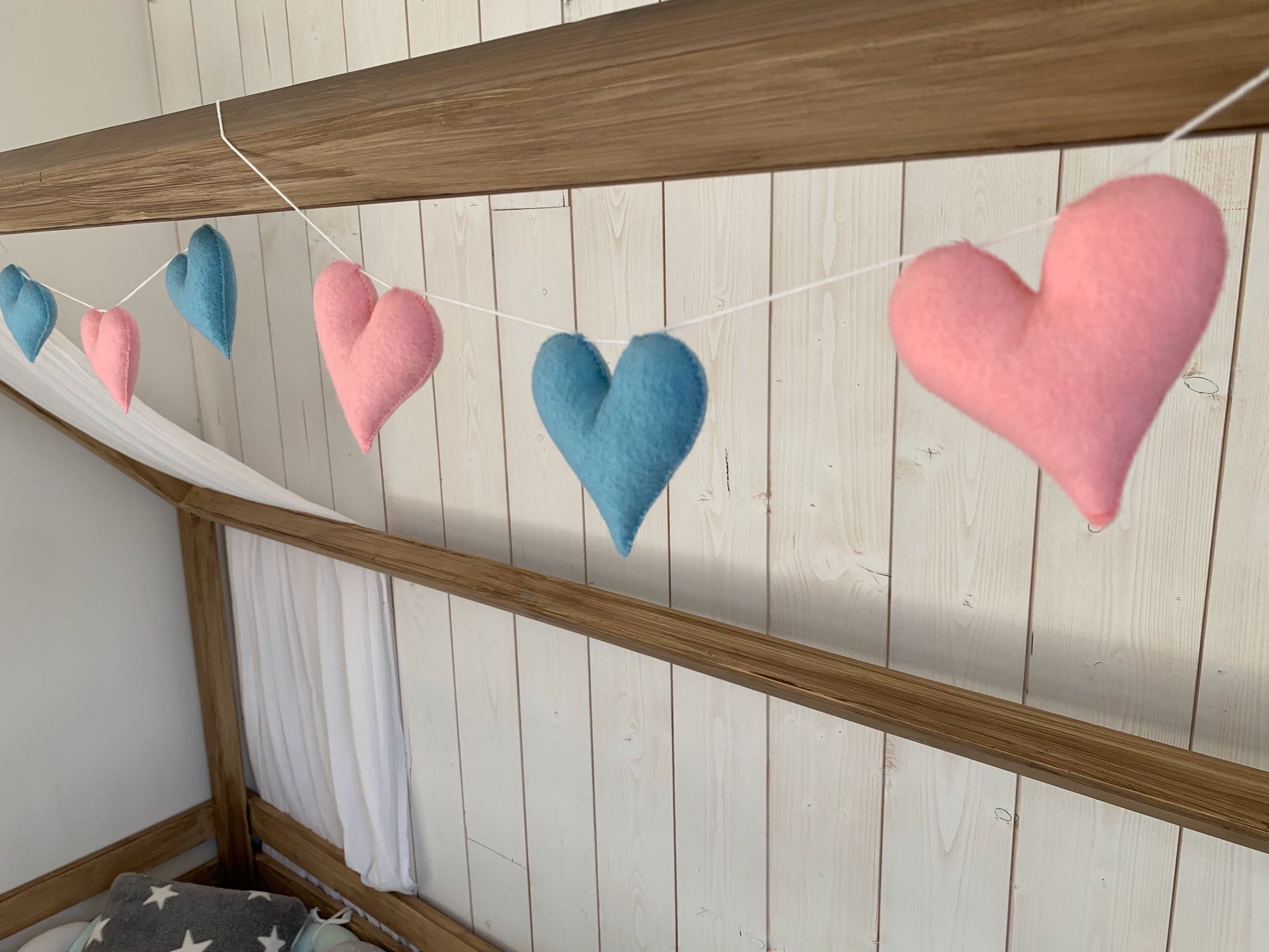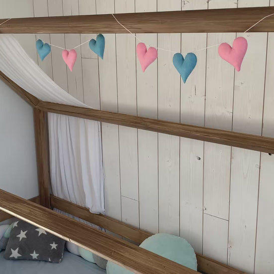 Une jolie guirlande aux couleurs douces, idéale pour décorer un lit cabane! Elle habillera aussi parfaitement un mur ou un lit à barreaux.