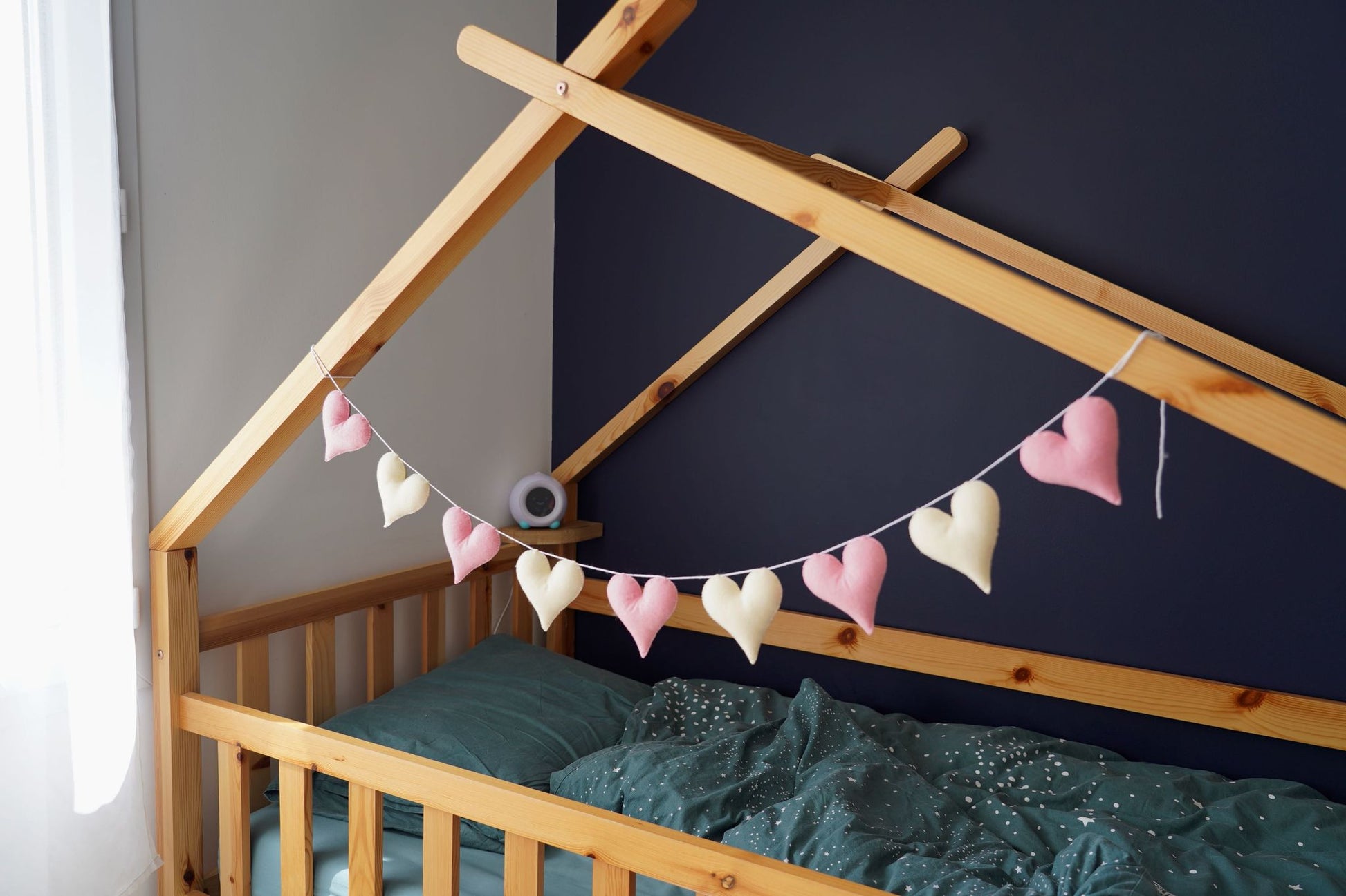 Une jolie guirlande aux couleurs douces, idéale pour décorer un lit cabane! Elle habillera aussi parfaitement un mur ou un lit à barreaux.