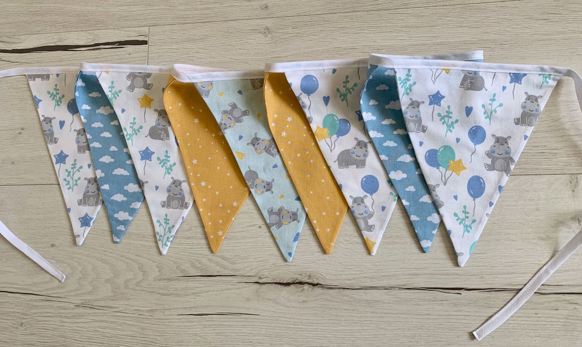 Guirlande de 9 fanions en tissu coton oeko-tex. Thème "hippopotames".
