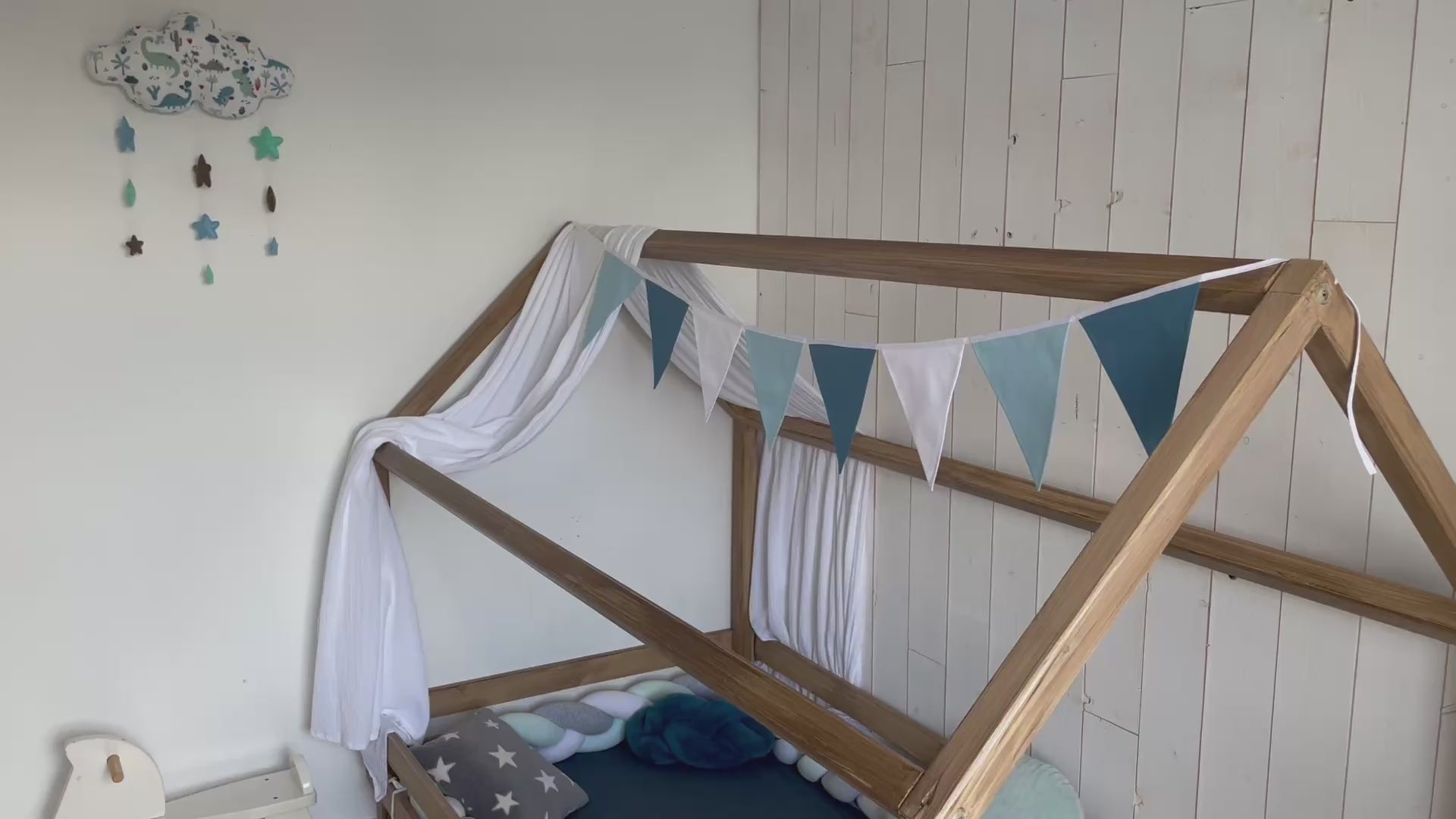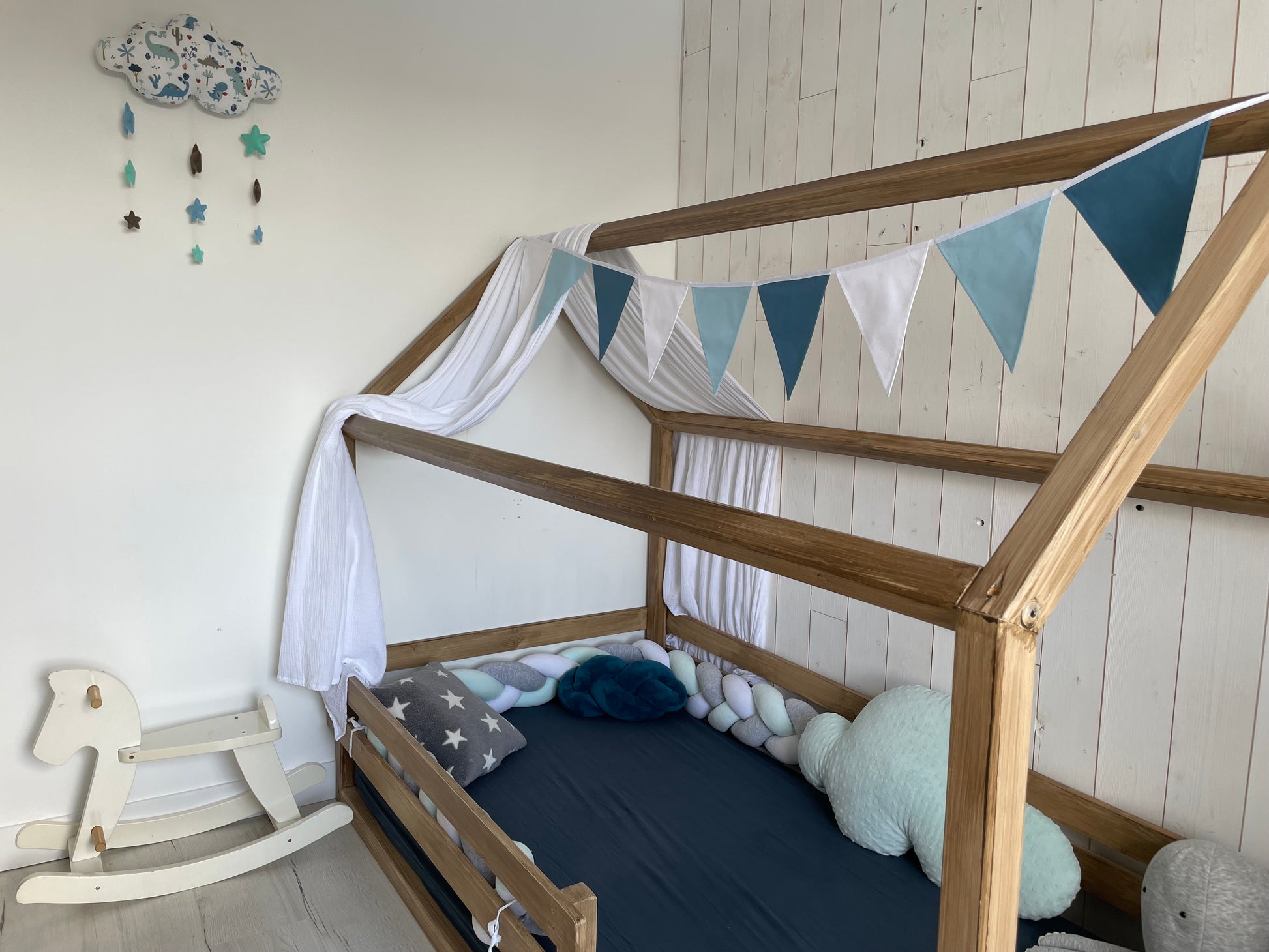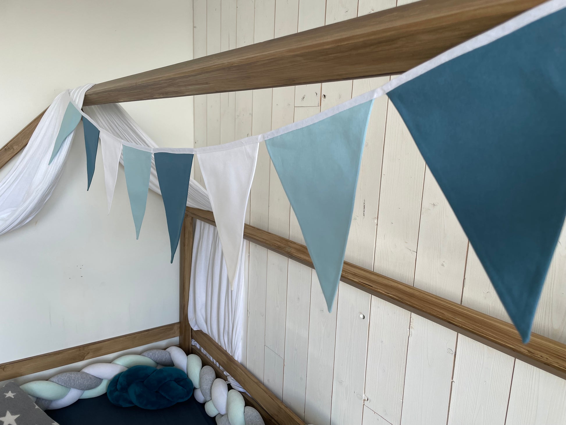 Une guirlande élégante pour décorer la chambre d'un garçon dans les doux tons bleus.