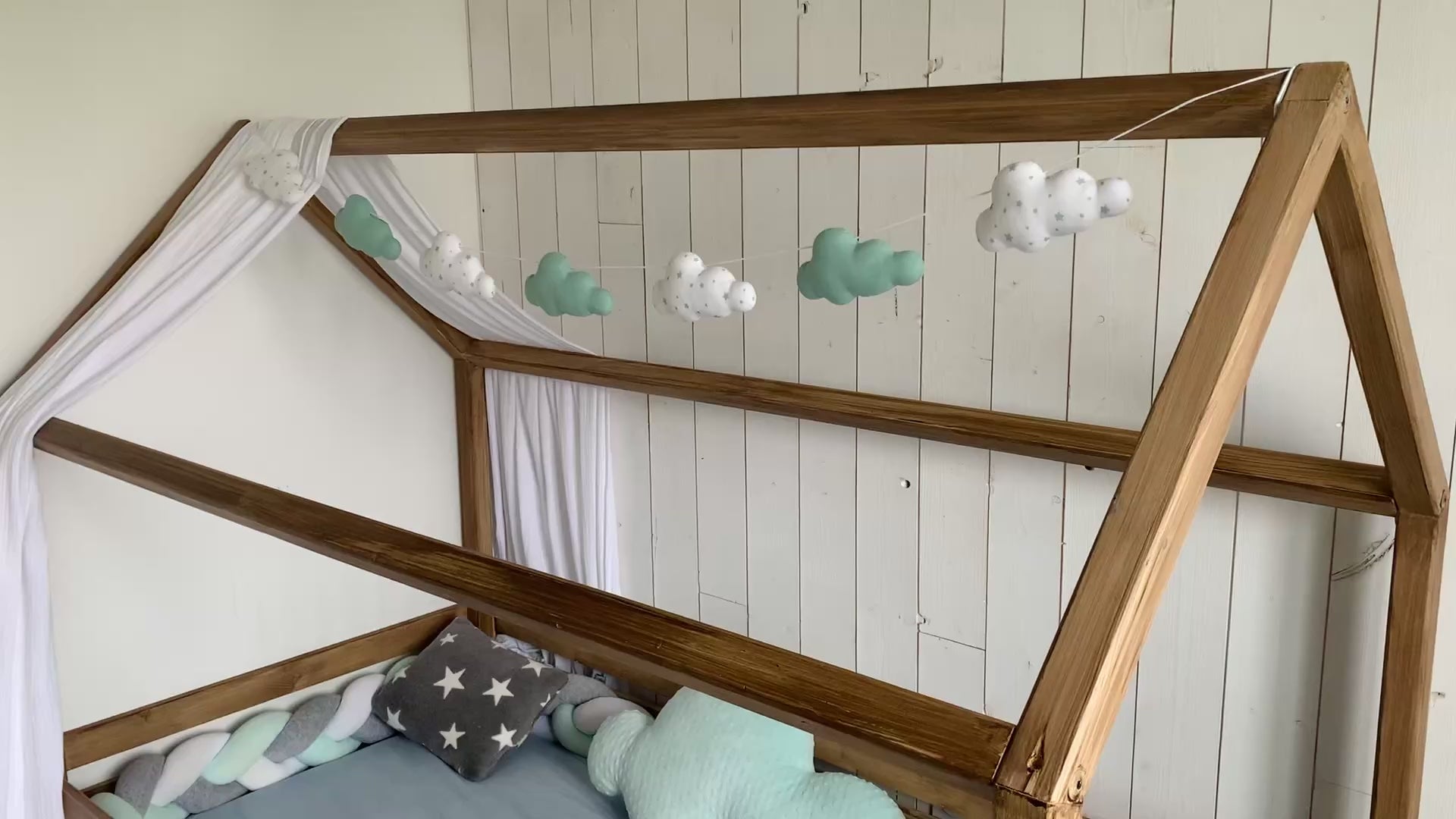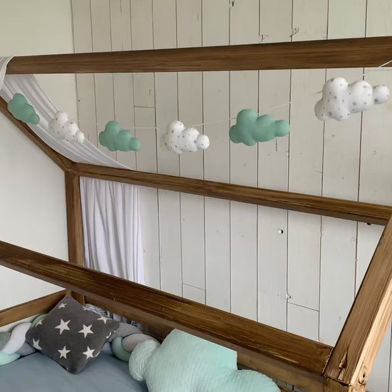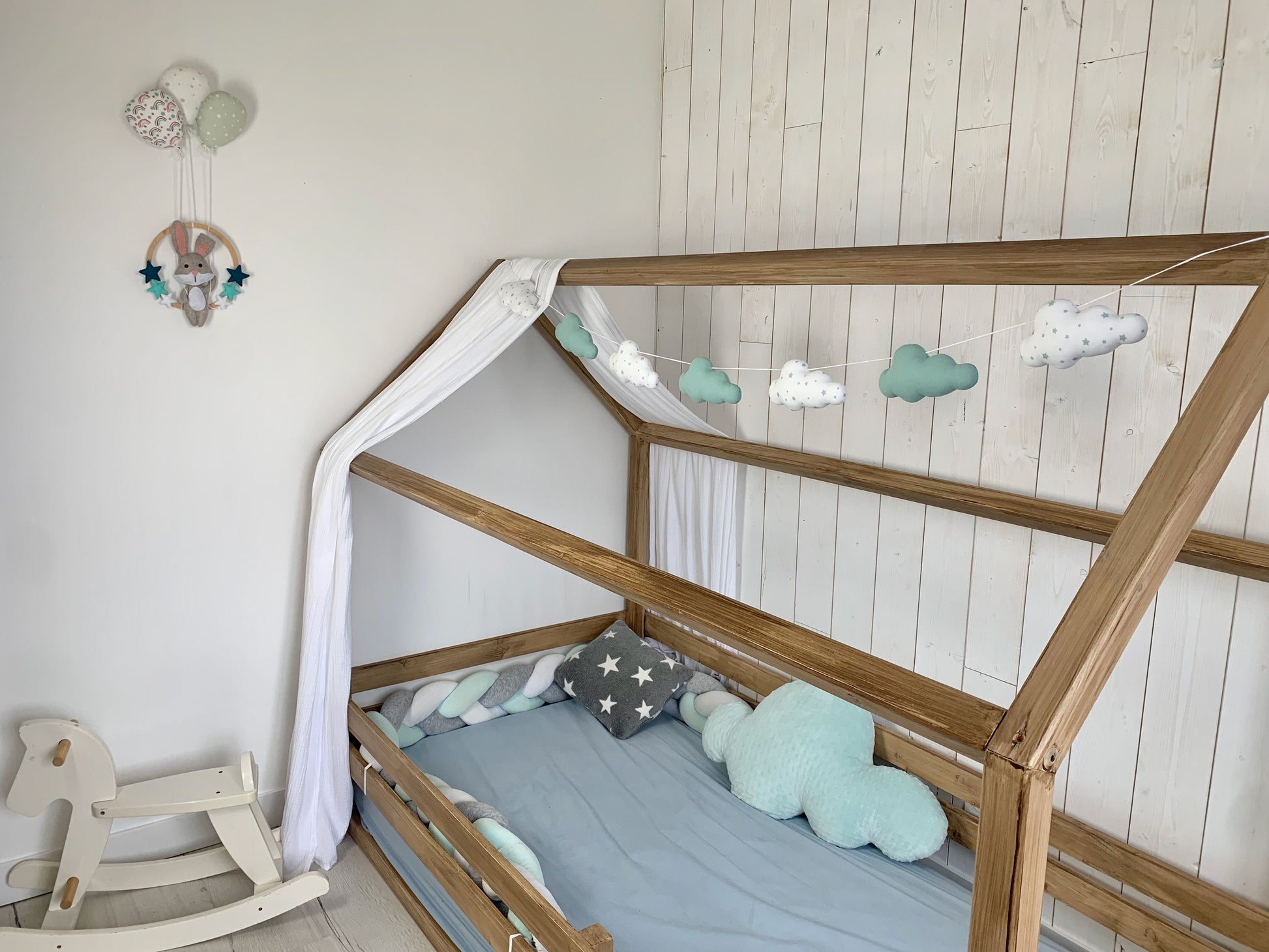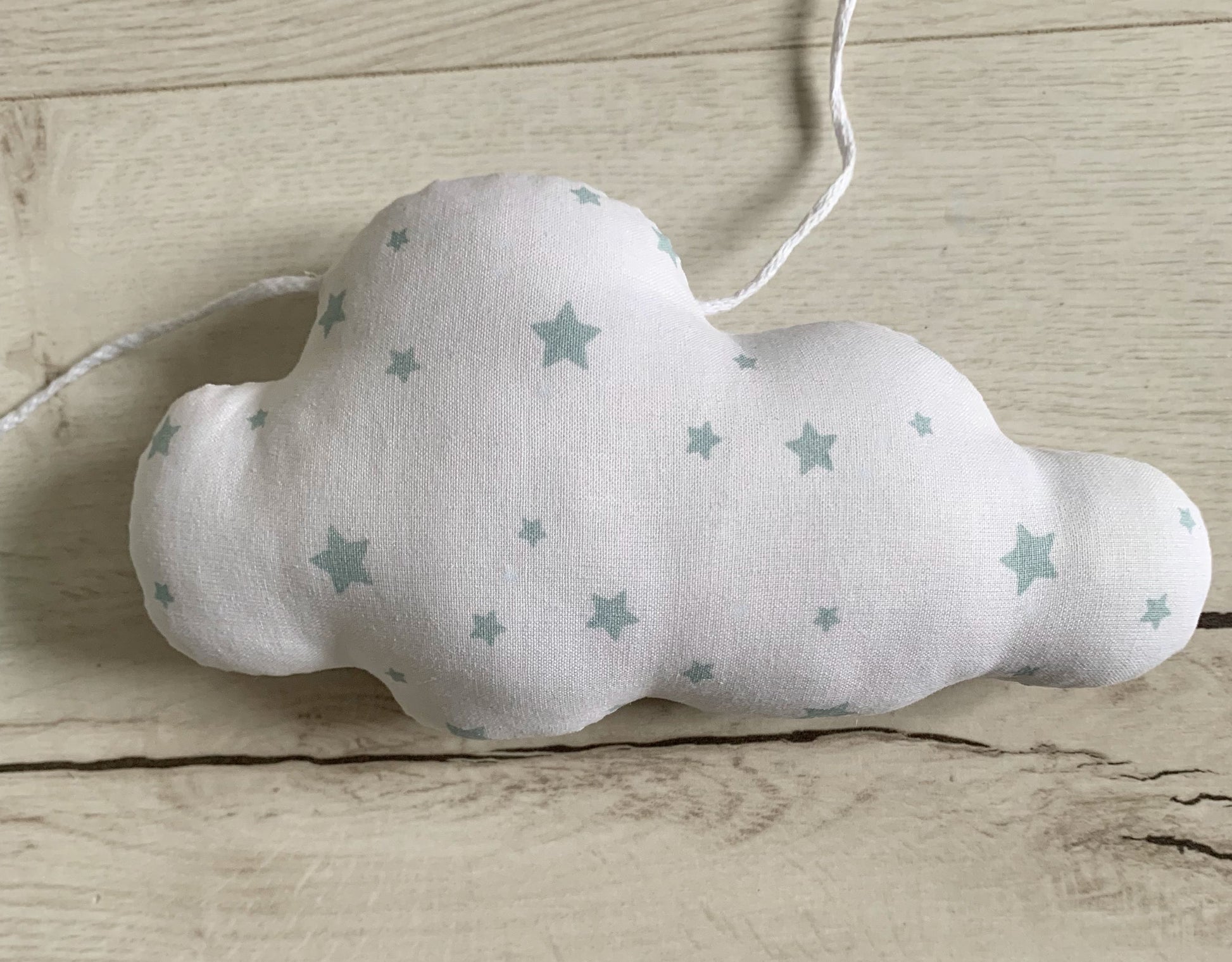 Une décoration aux couleurs douces et mixtes à accrocher à un lit cabane, un lit à barreaux ou un mur. Fait main avec du tissu en coton oeko-tex. Rembourrage 100% polyester.