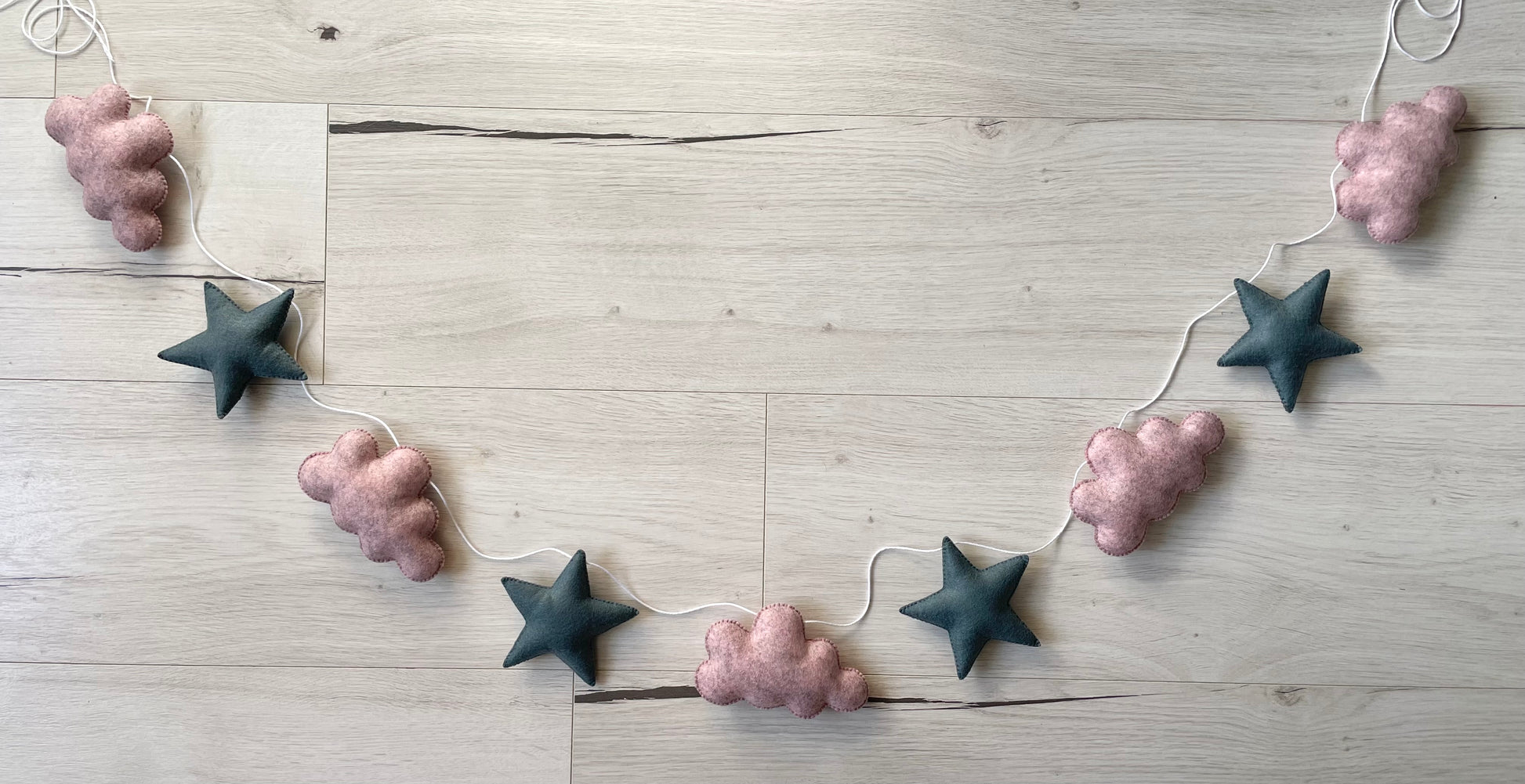 Guirlande de 5 nuages et de 4 étoiles en feutrine. Vieux rose chiné et gris bleu.