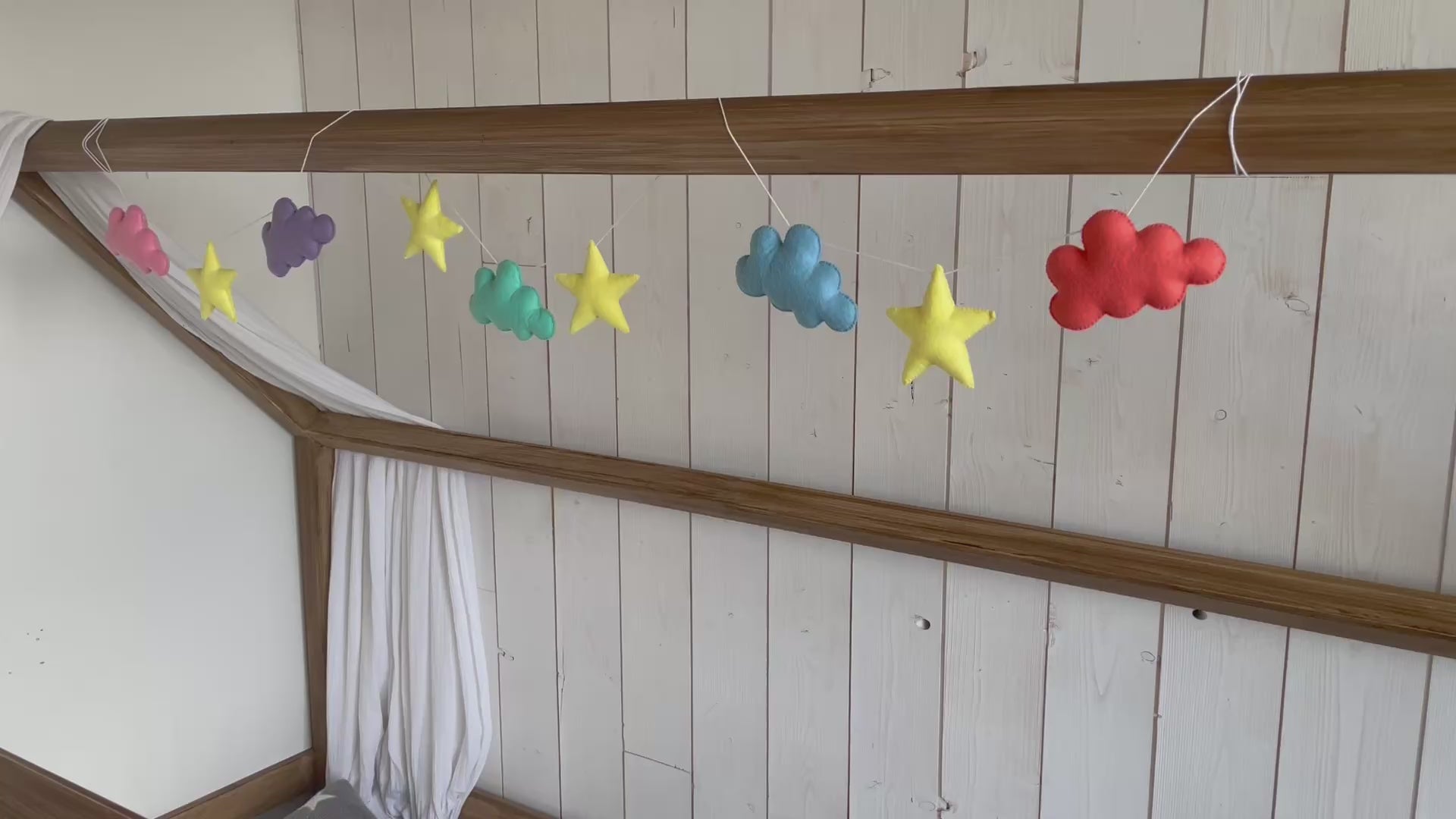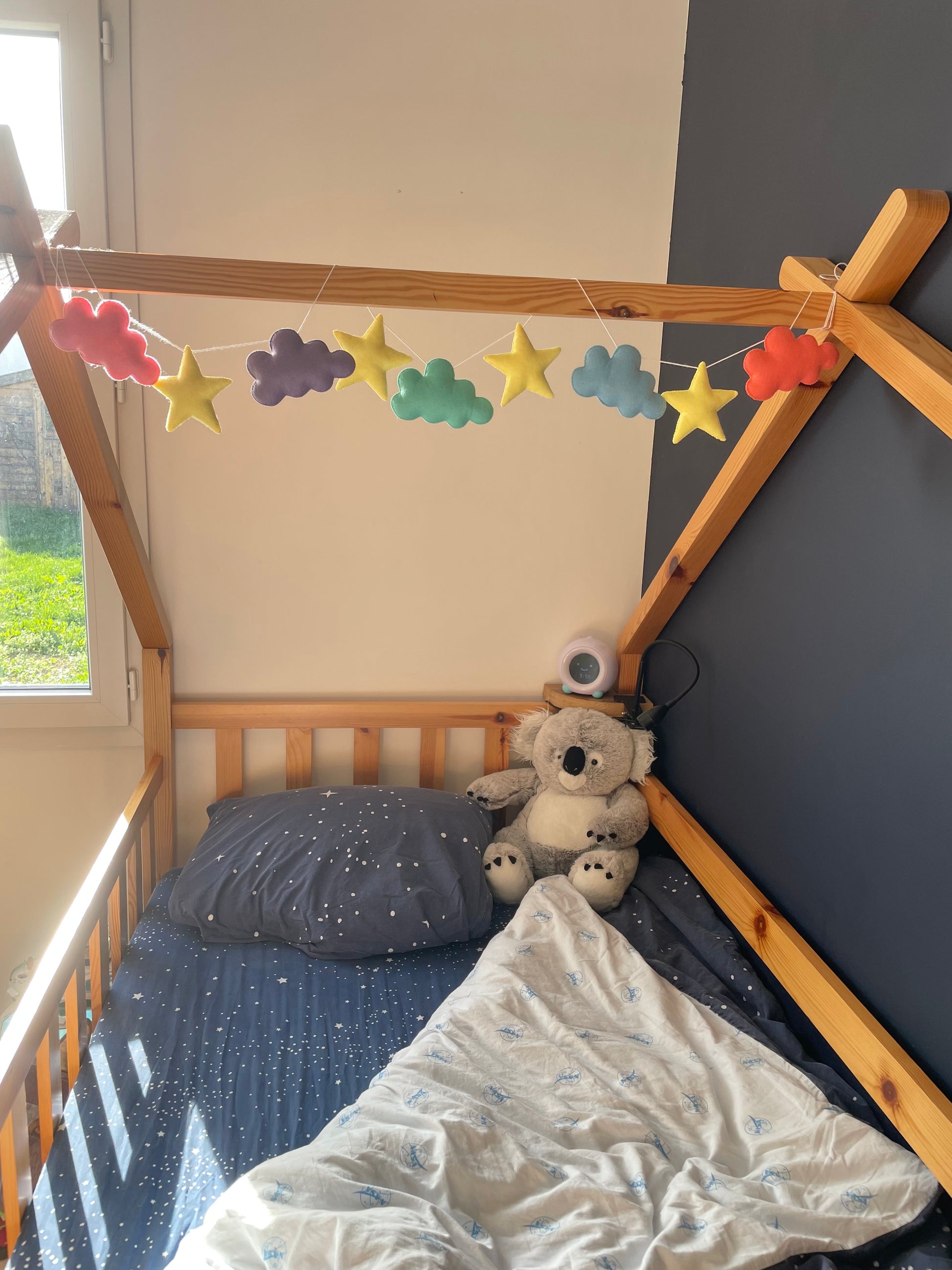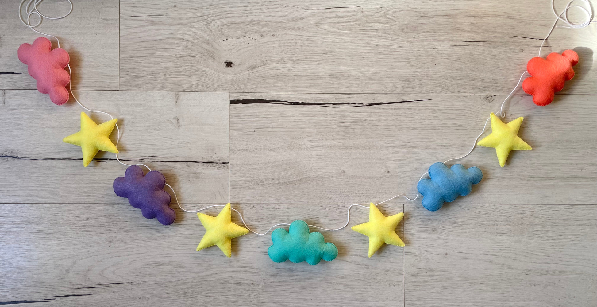 Guirlande de 5 nuages et de 4 étoiles en feutrine. Rose, jaune, lila, menthe, bleu et corail.