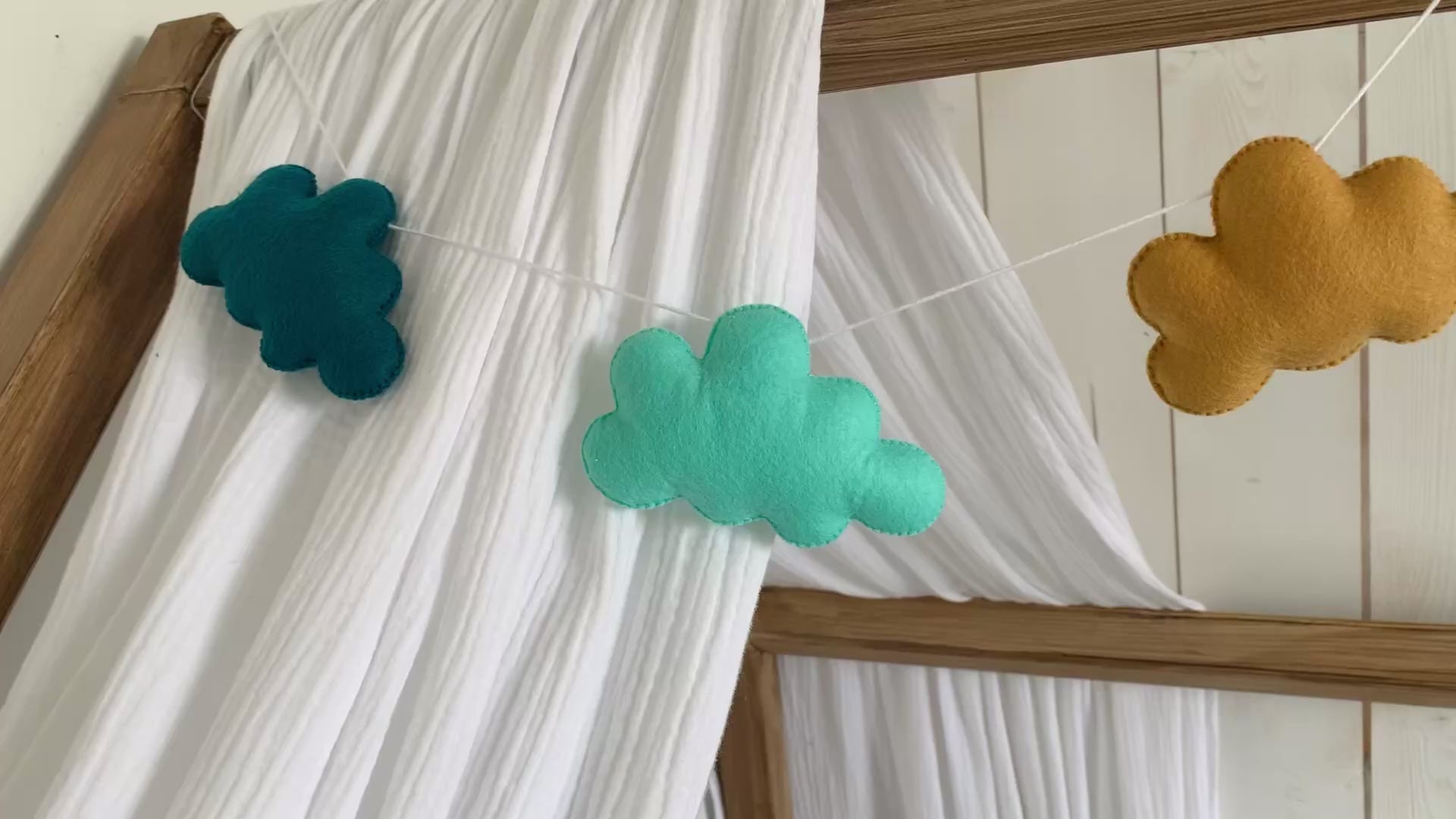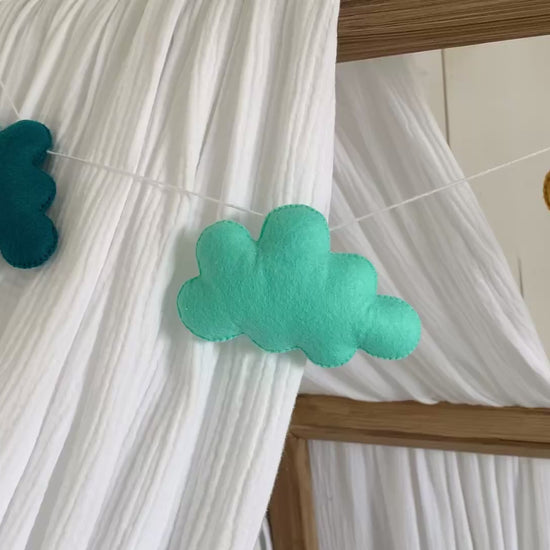 Guirlande de 9 nuages en feutrine. Pétrole, menthe, camel et blanc.