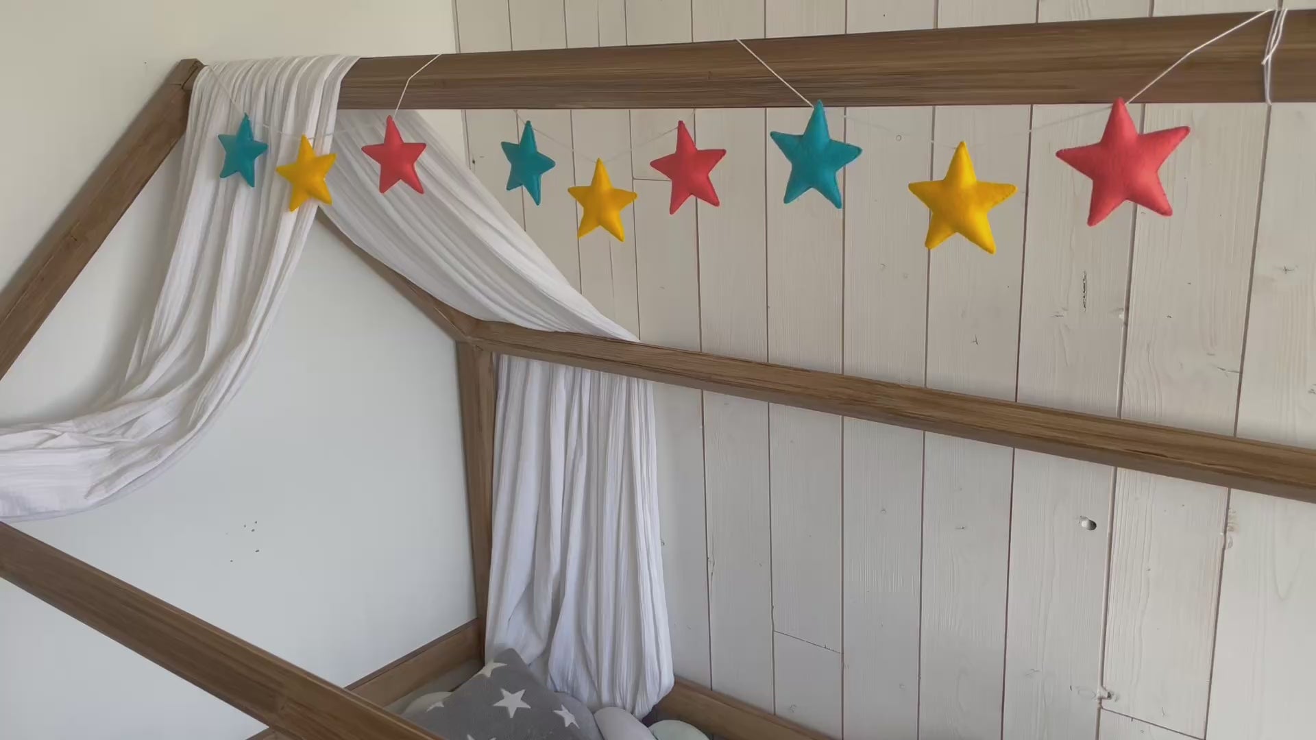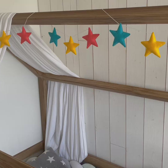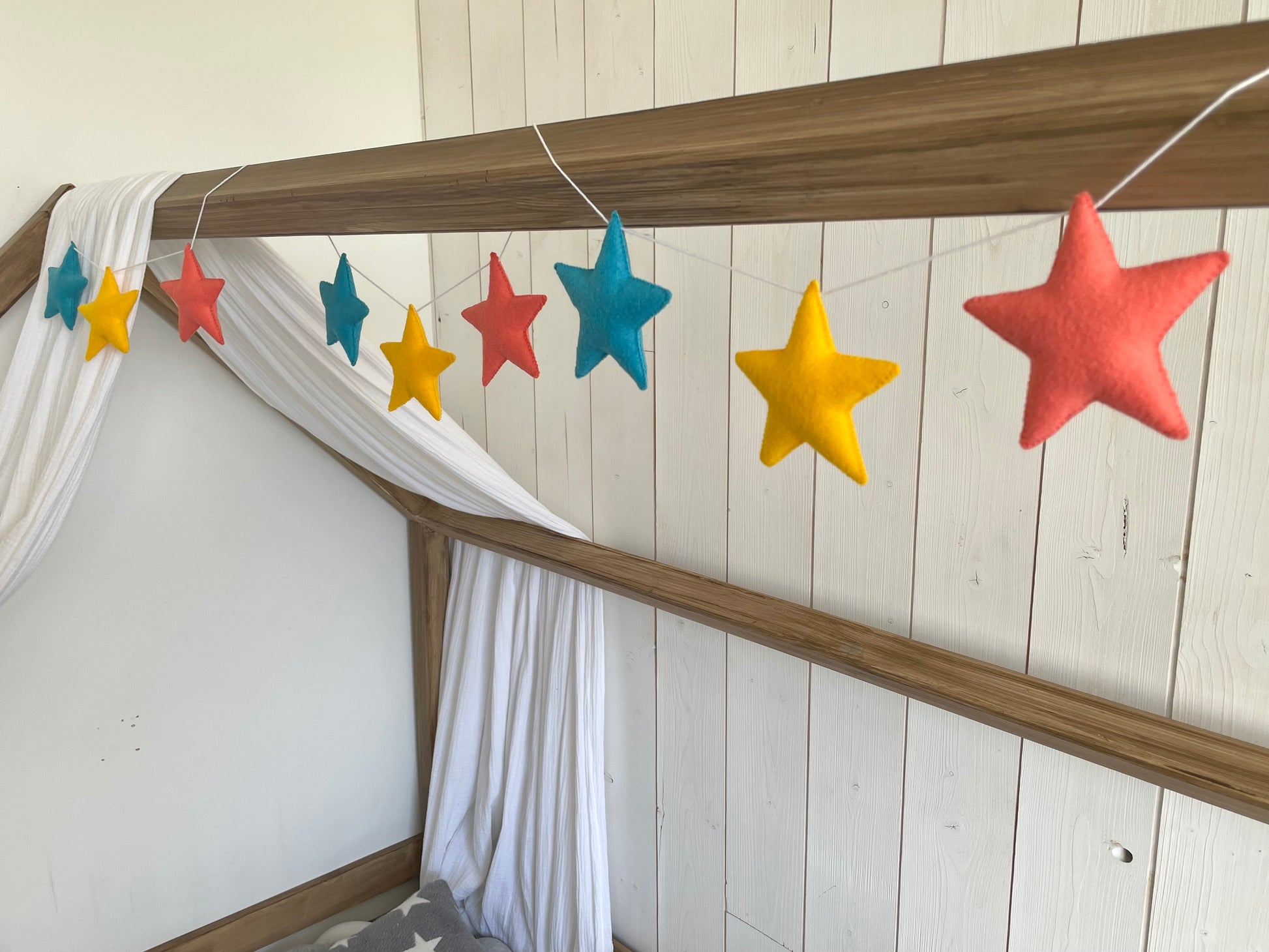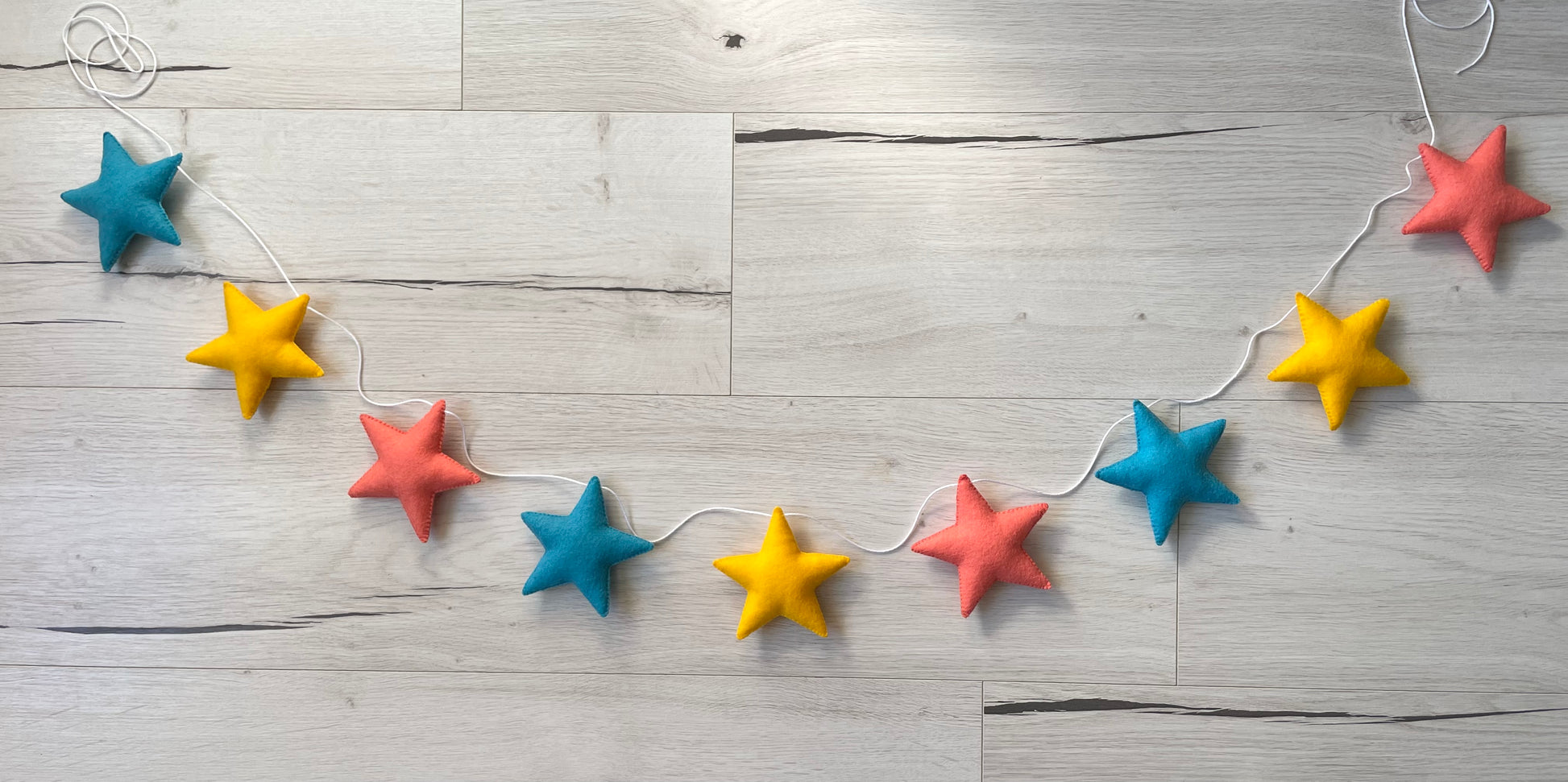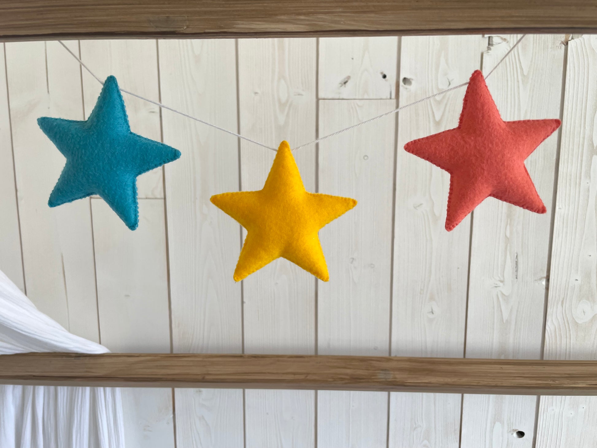 Guirlande de 9 étoiles en feutrine. Bleu, jaune maïs et corail.