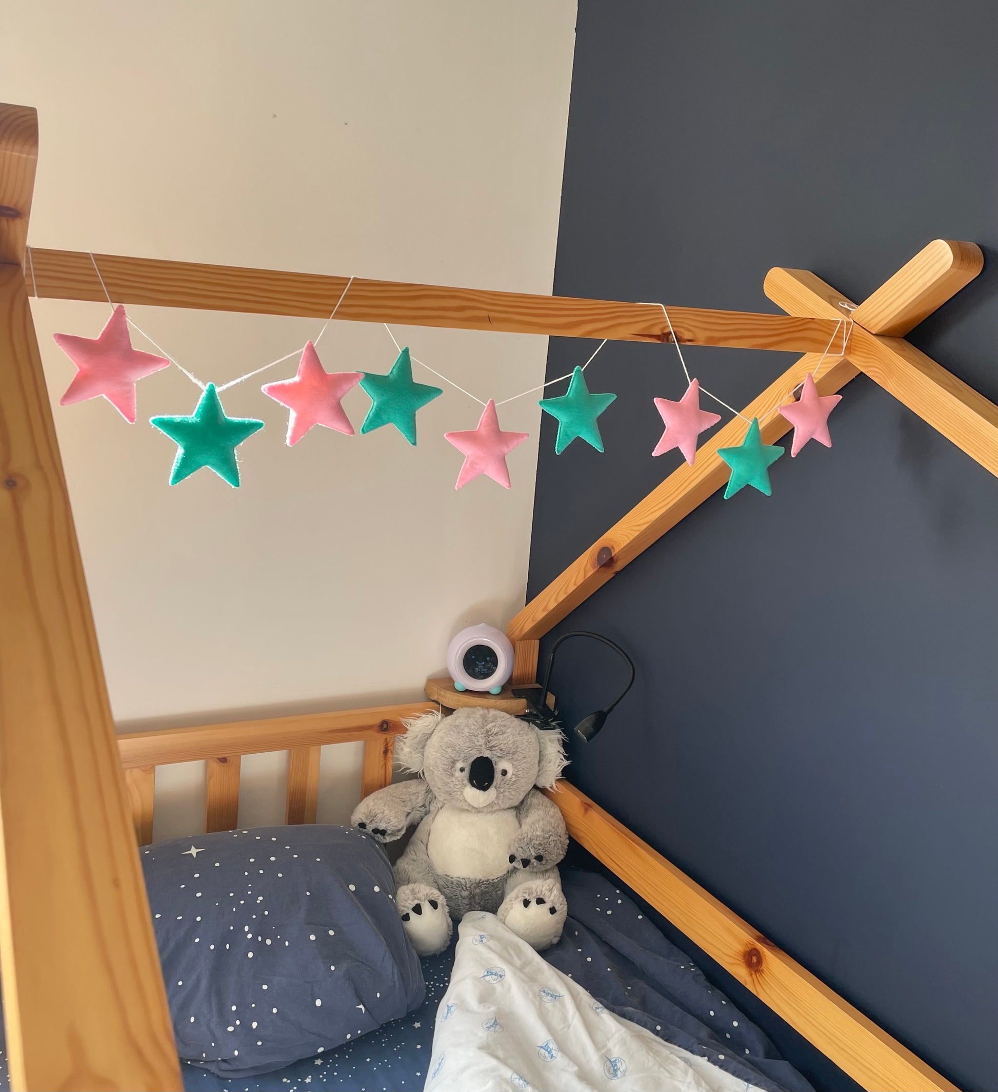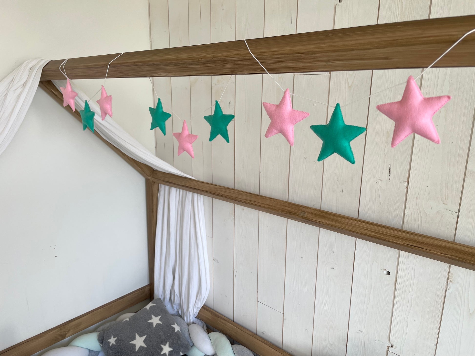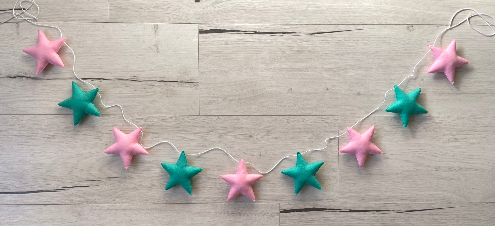Guirlande de 9 étoiles en feutrine. Turquoise et rose.