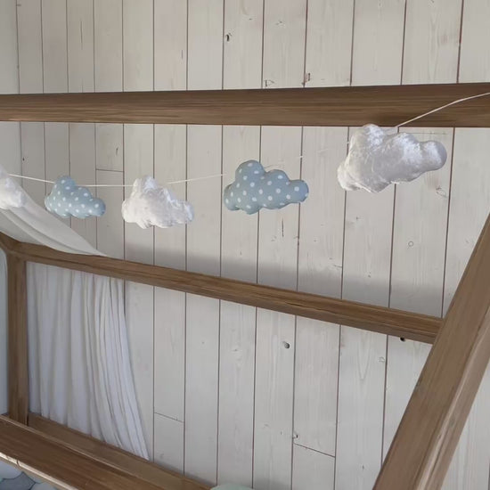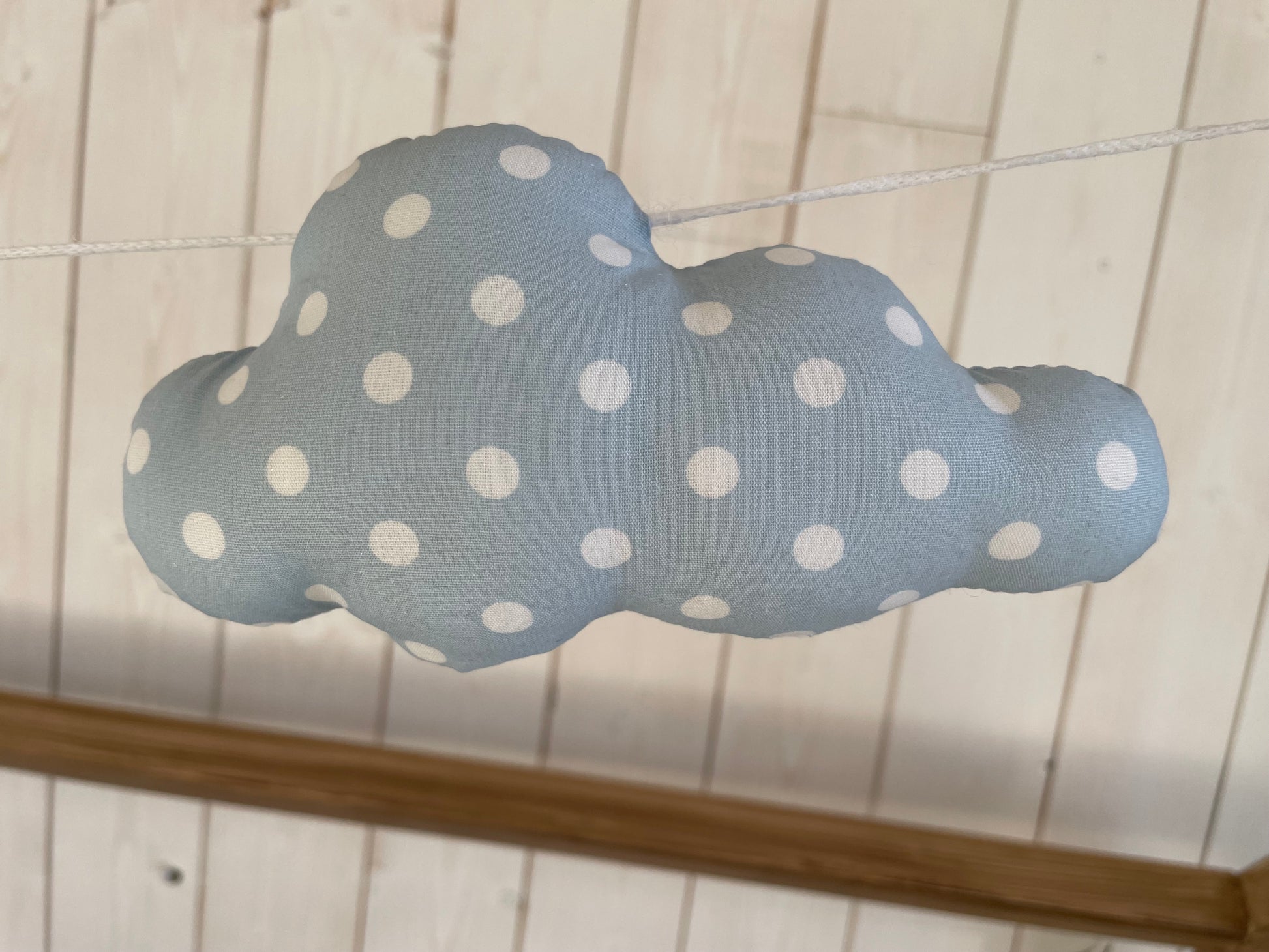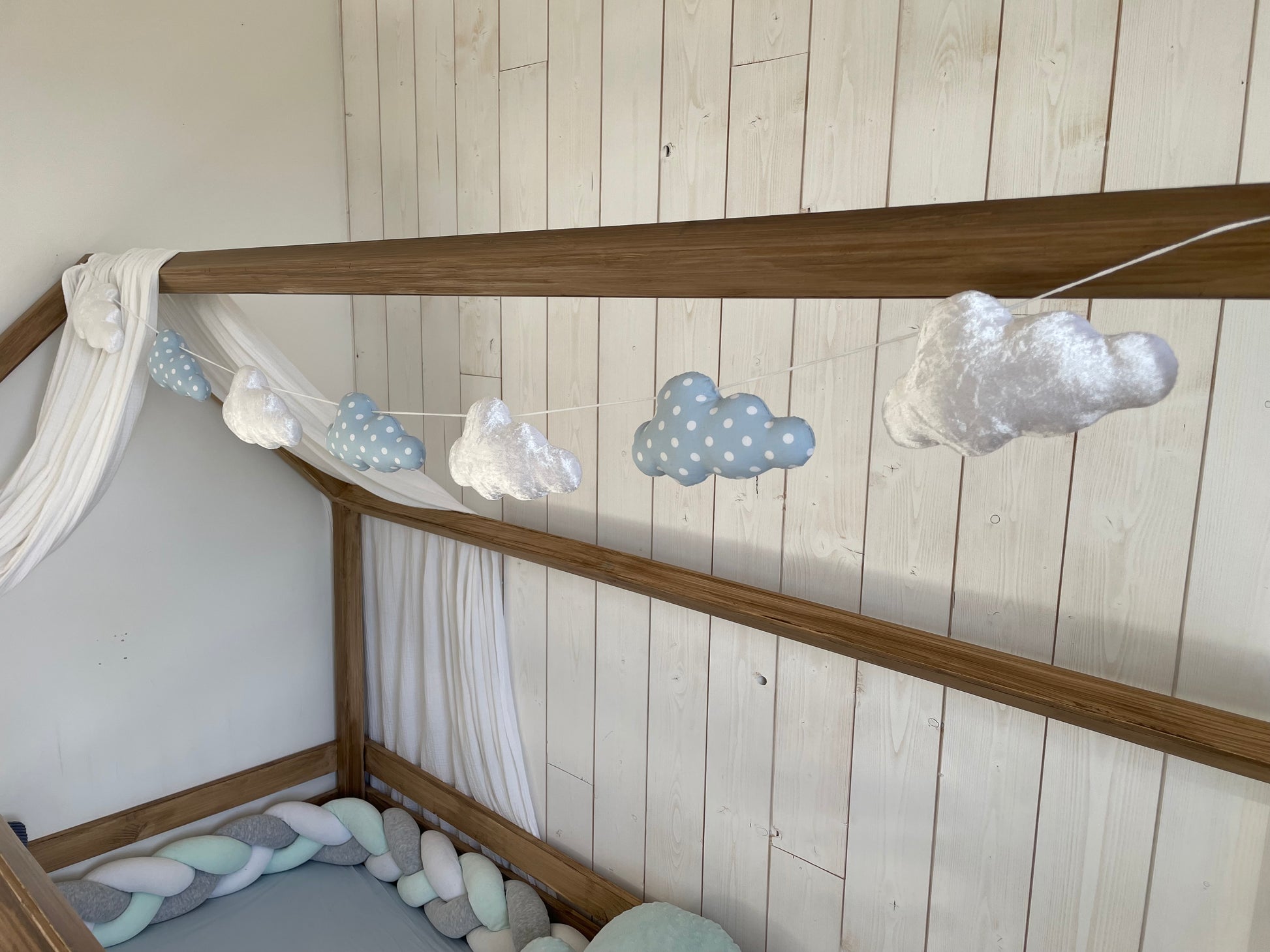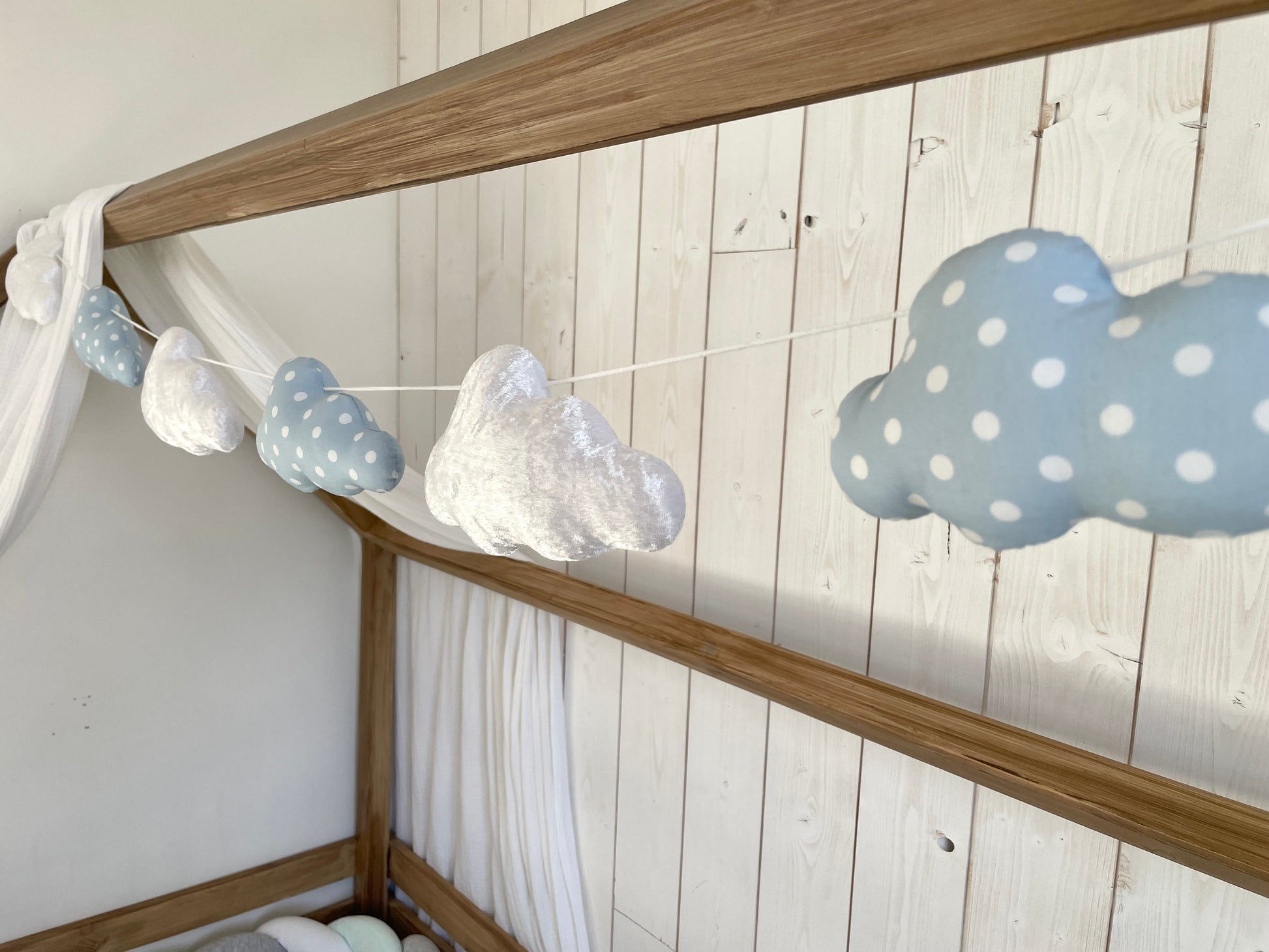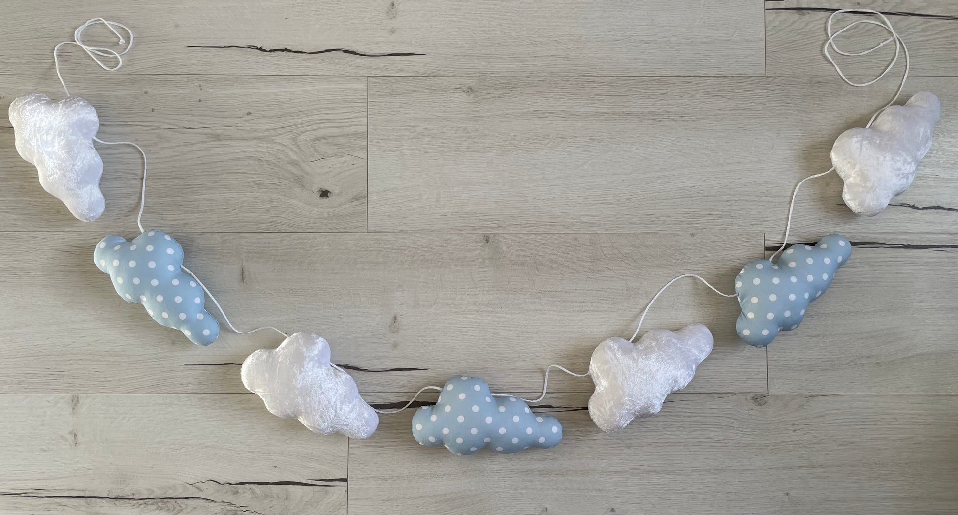 Guirlande de 7 nuages en velours blanc et imprimé coton.