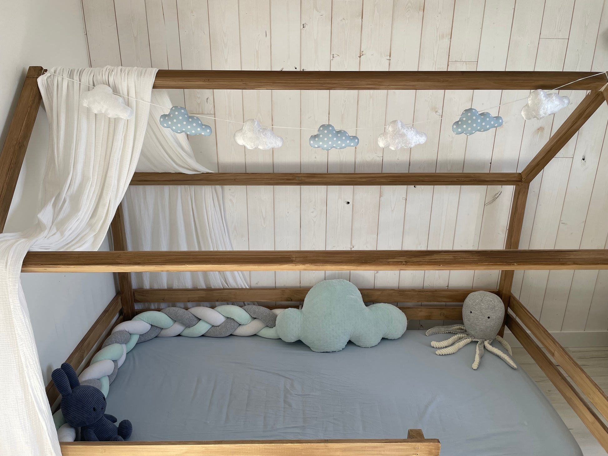 Une jolie guirlande pour décorer un lit cabane, un lit à barreaux ou un mur. Le velours apportera une touche de brillance et de douceur à la chambre de bébé.