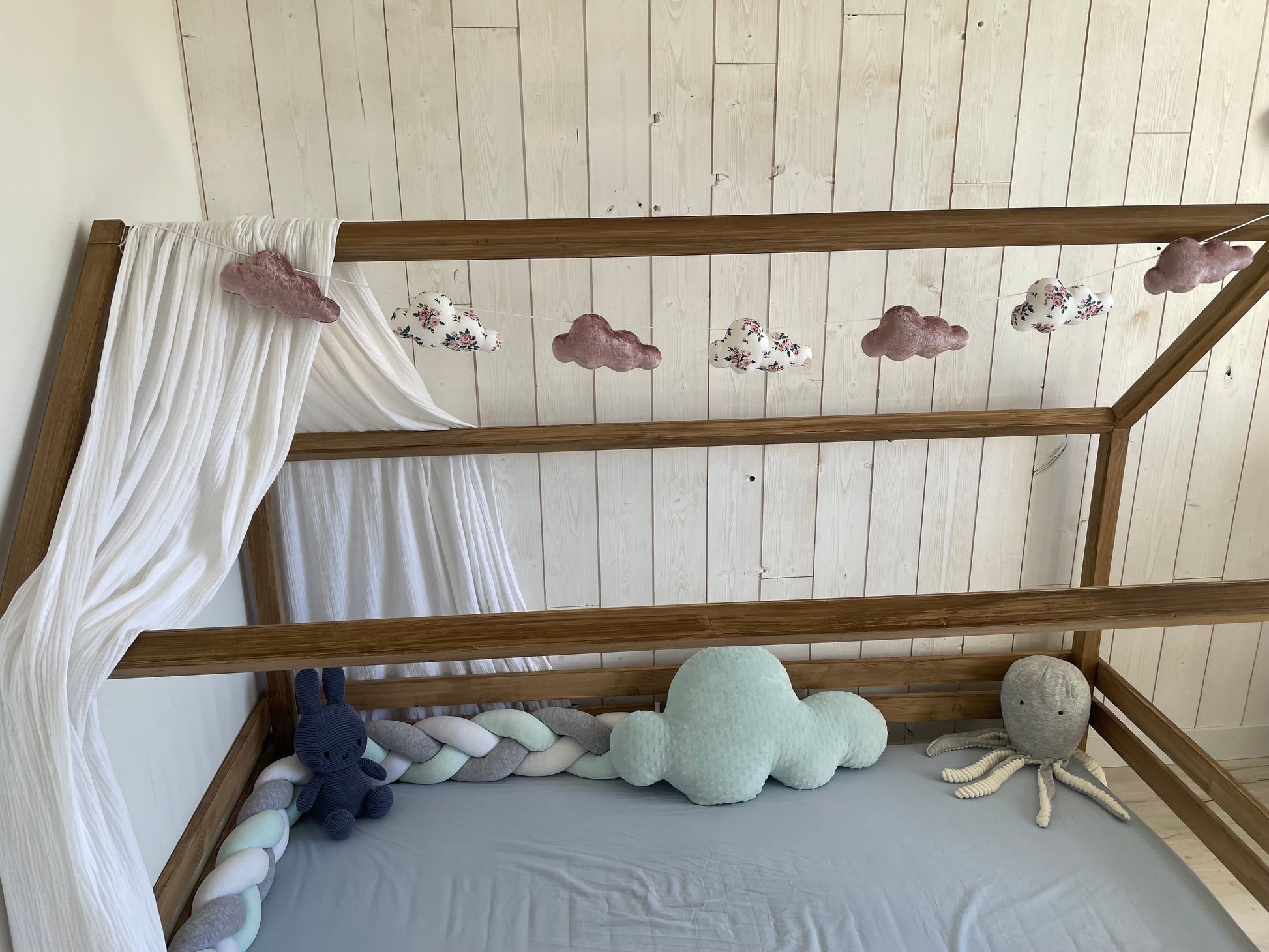 Une jolie guirlande pour décorer un lit cabane, un lit à barreaux ou un mur. Le mélange du velours et de l'imprimé apportera douceur et fantaisie à la chambre de bébé.