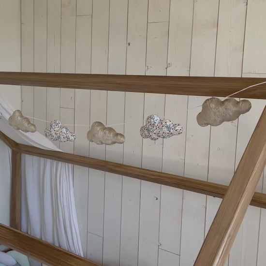 Guirlande de 7 nuages en velours beige et imprimé coton.