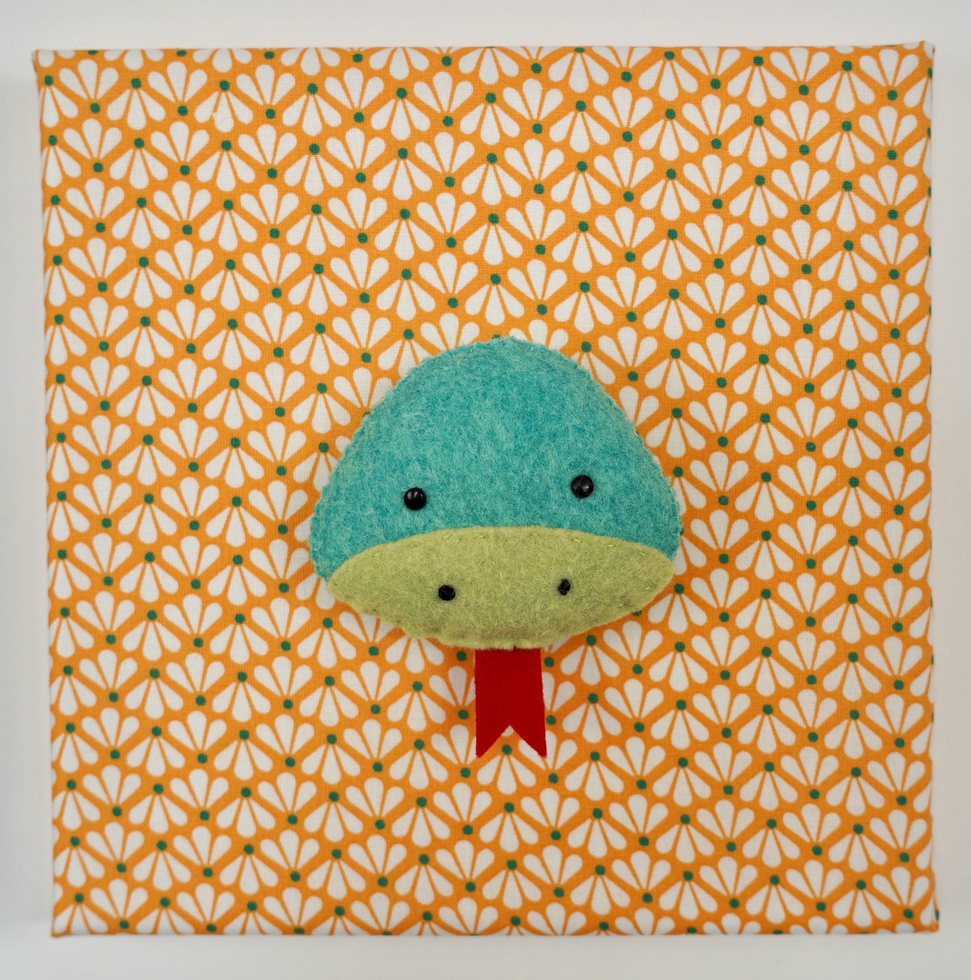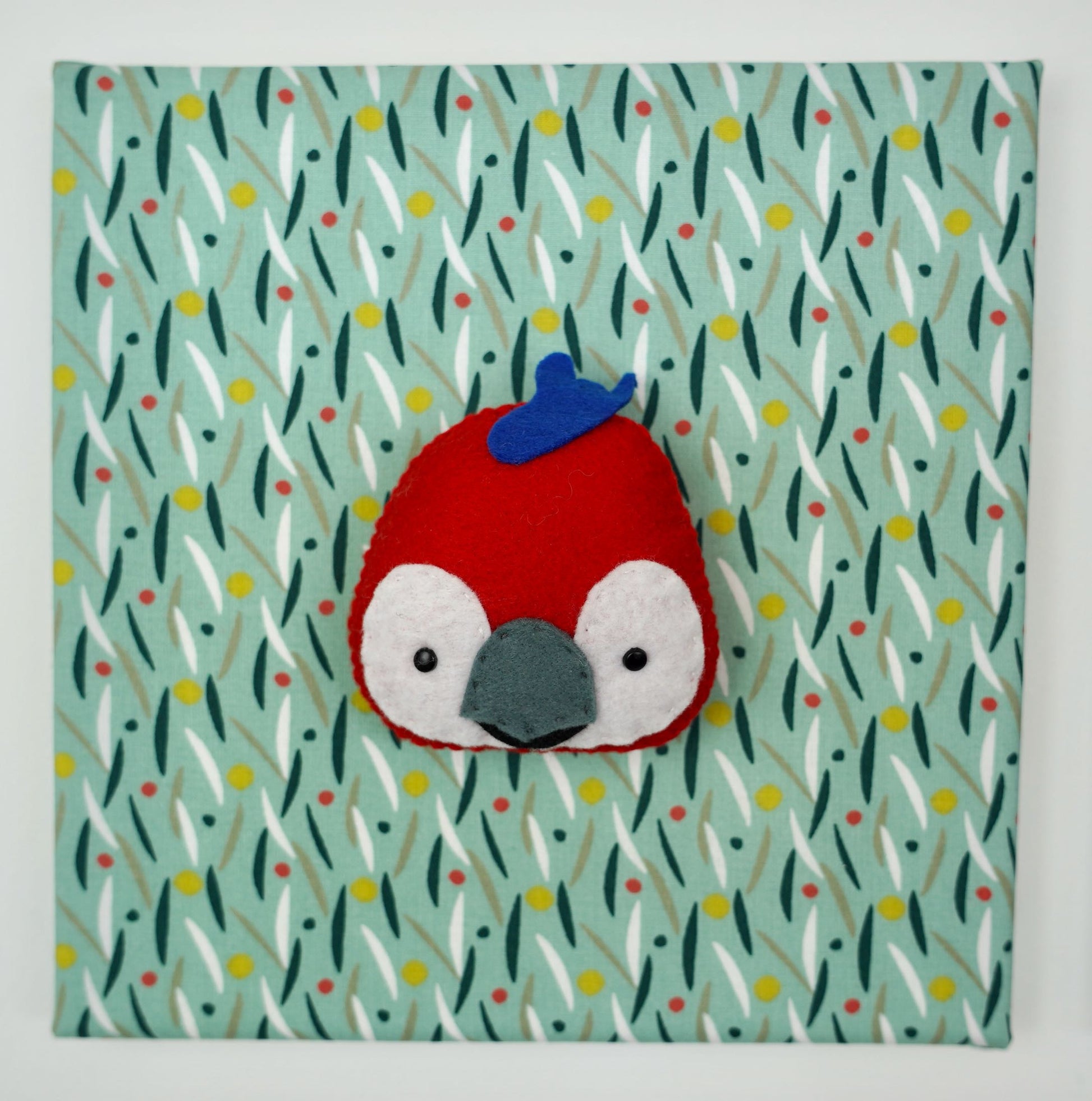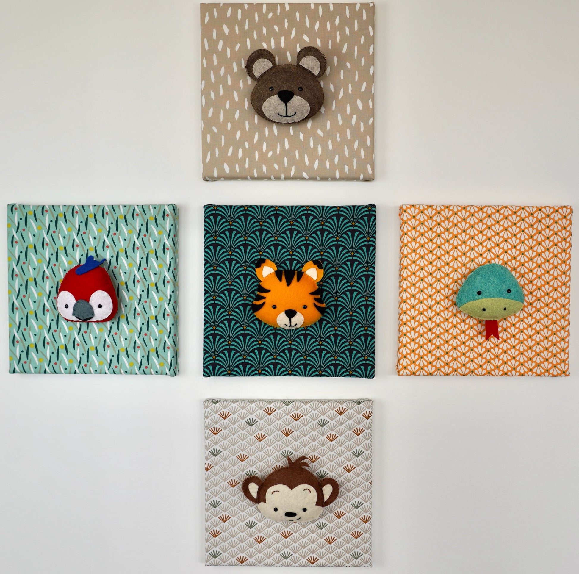 Tableaux animaux de la jungle. Perroquet, ours, serpent, singe et tigre en feutrine.