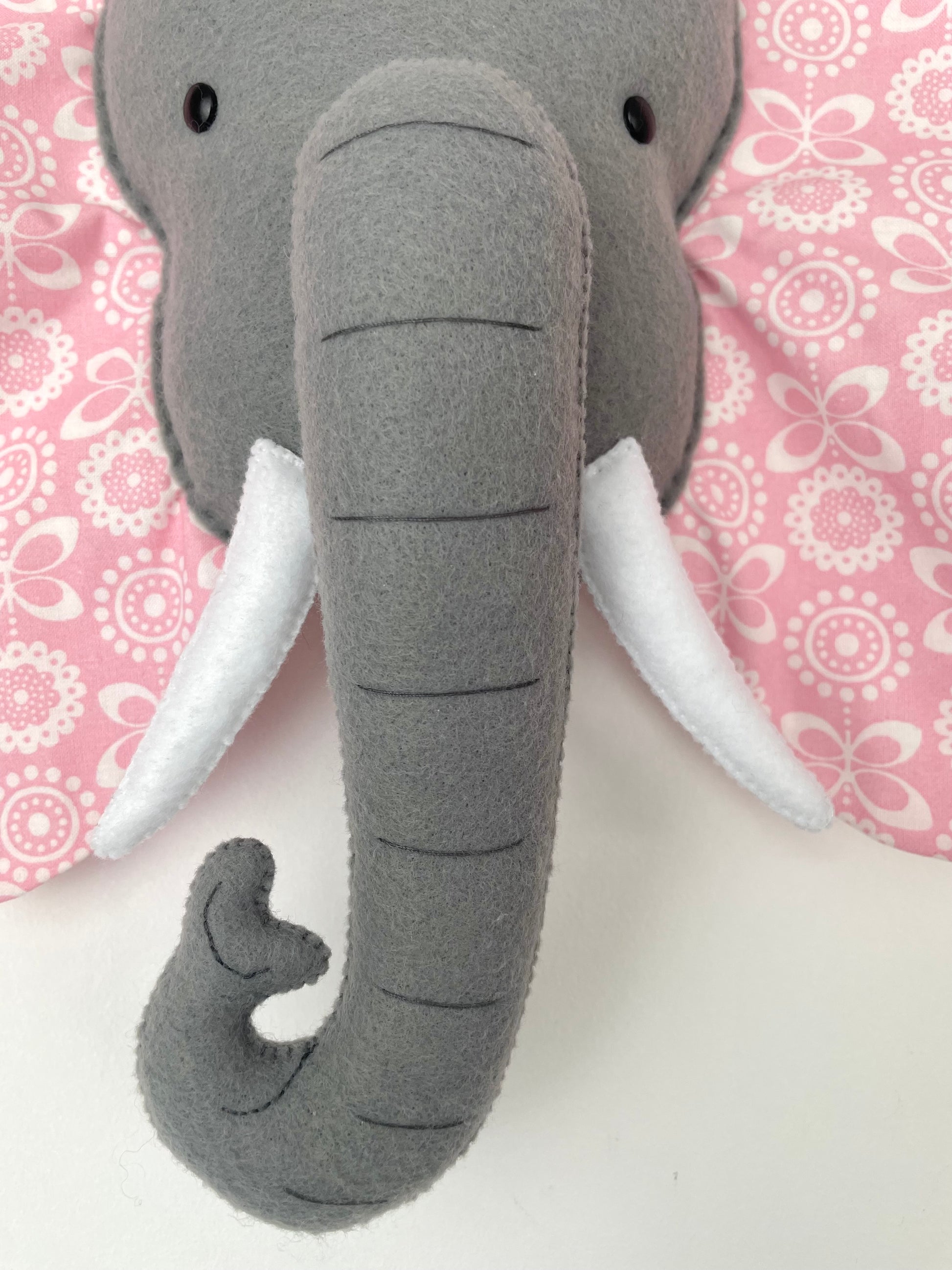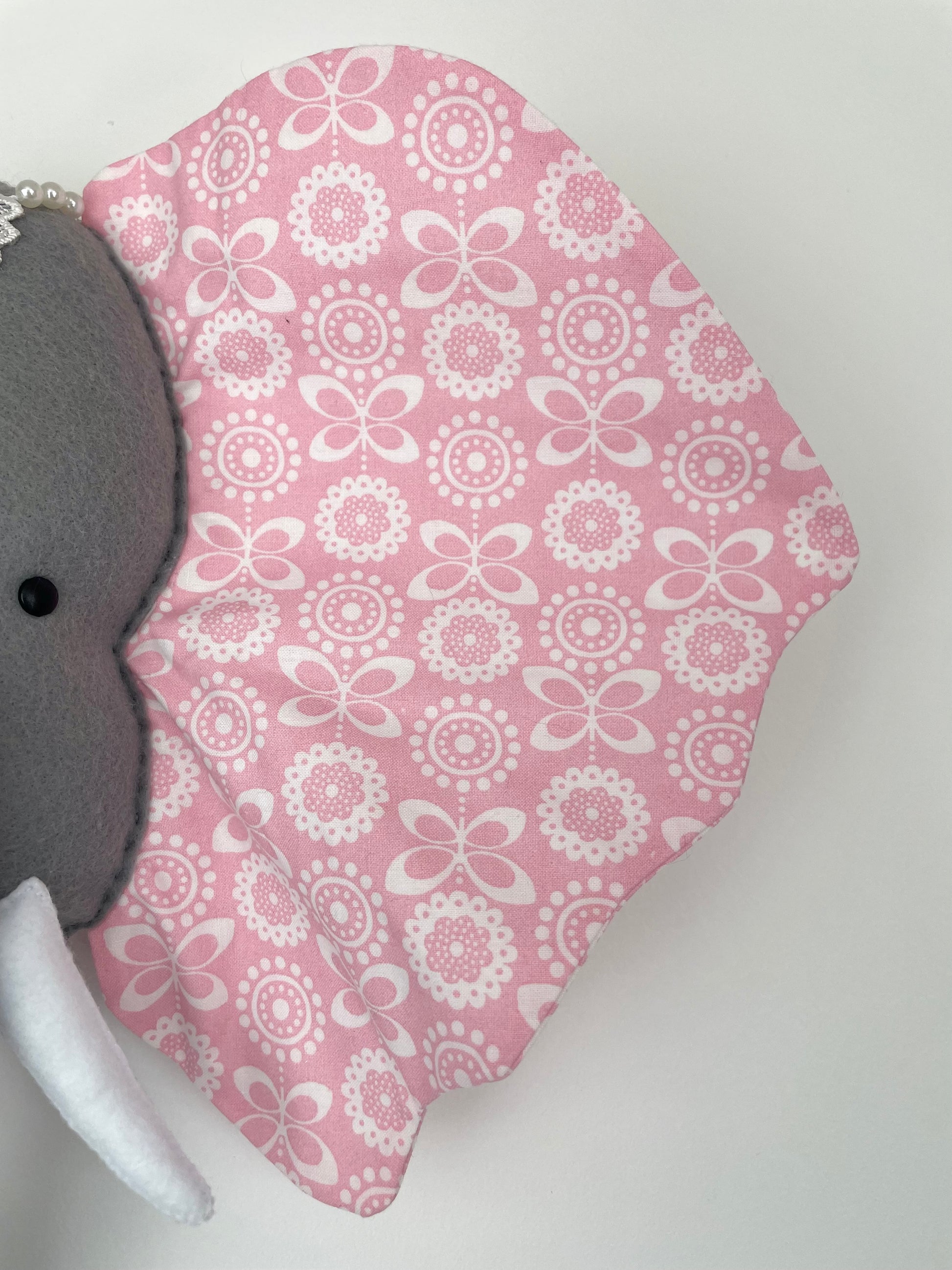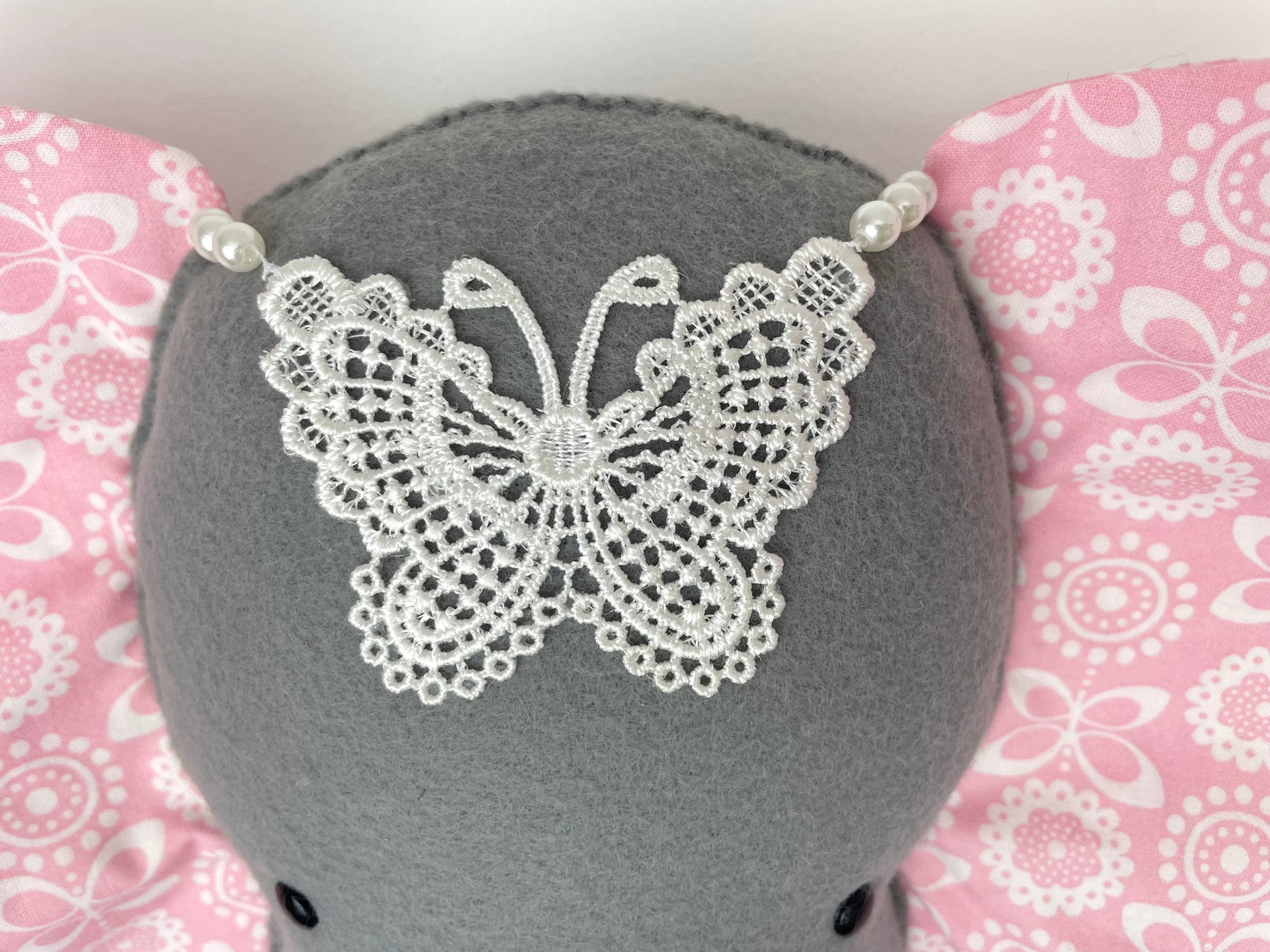 Tête en feutrine et oreilles en tissu coton oeko-tex imprimé fleurs et papillons. Ornement en dentelle et perles. Rembourrage 100% polyester.