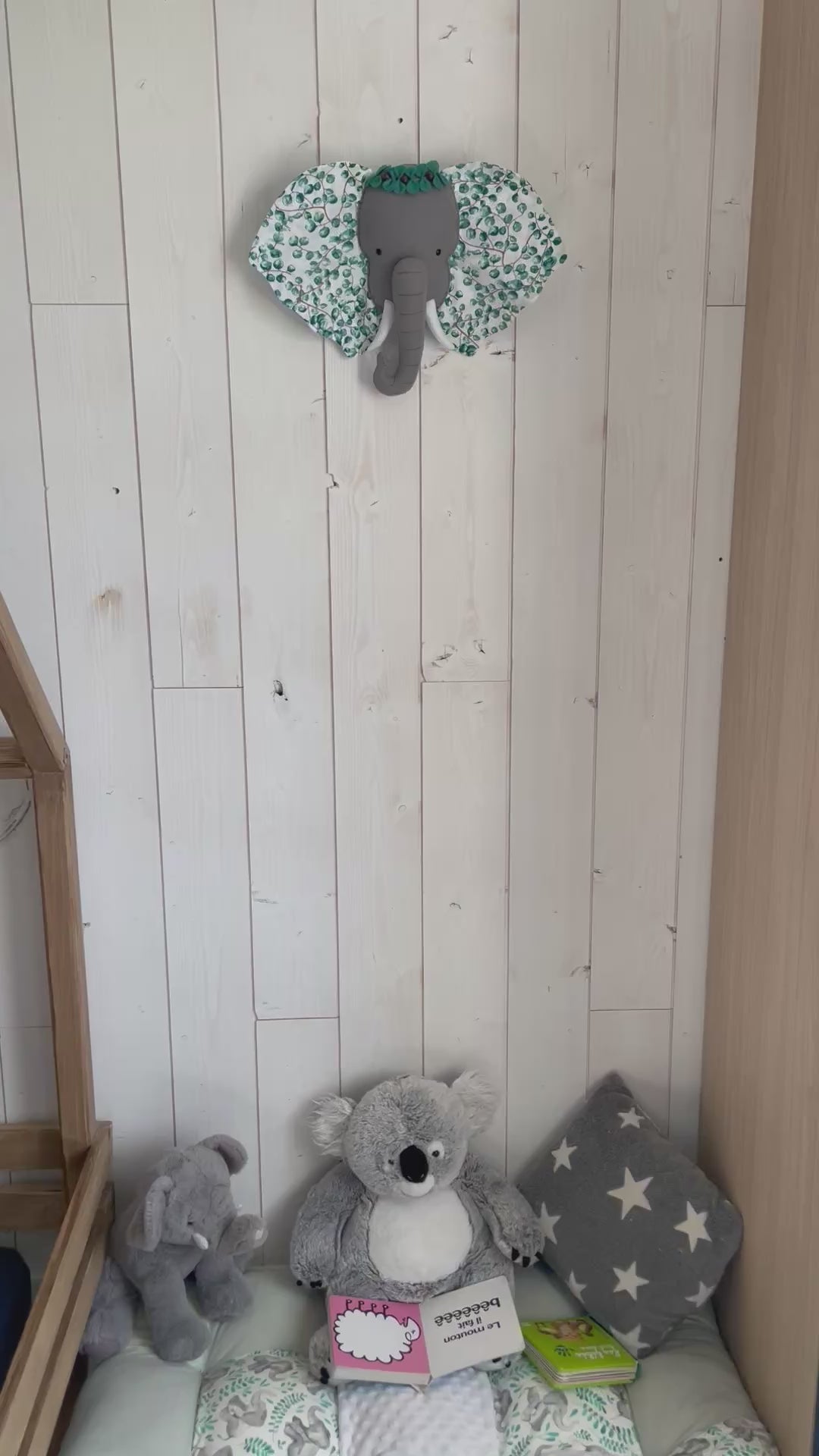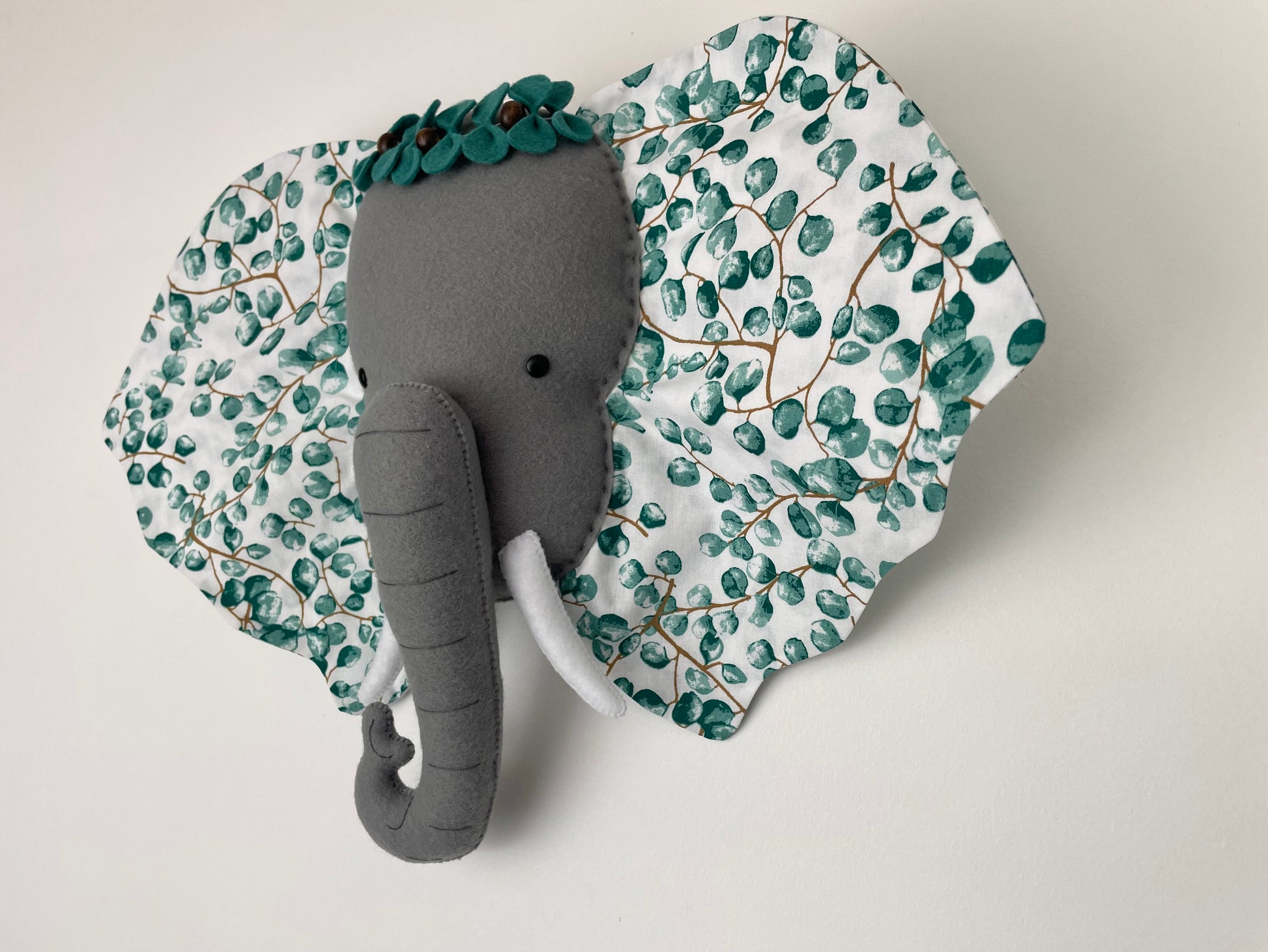 Tête en feutrine et oreilles en tissu coton oeko-tex imprimé eucalyptus. Ornement en perles et feutrine. Rembourrage 100% polyester.