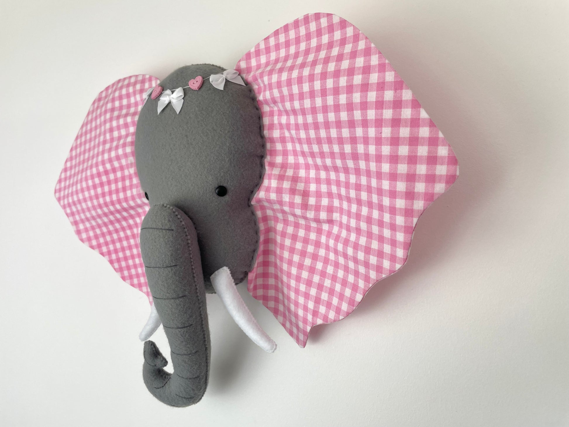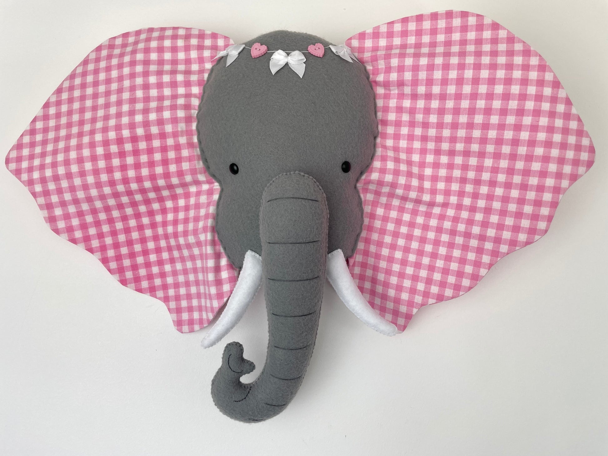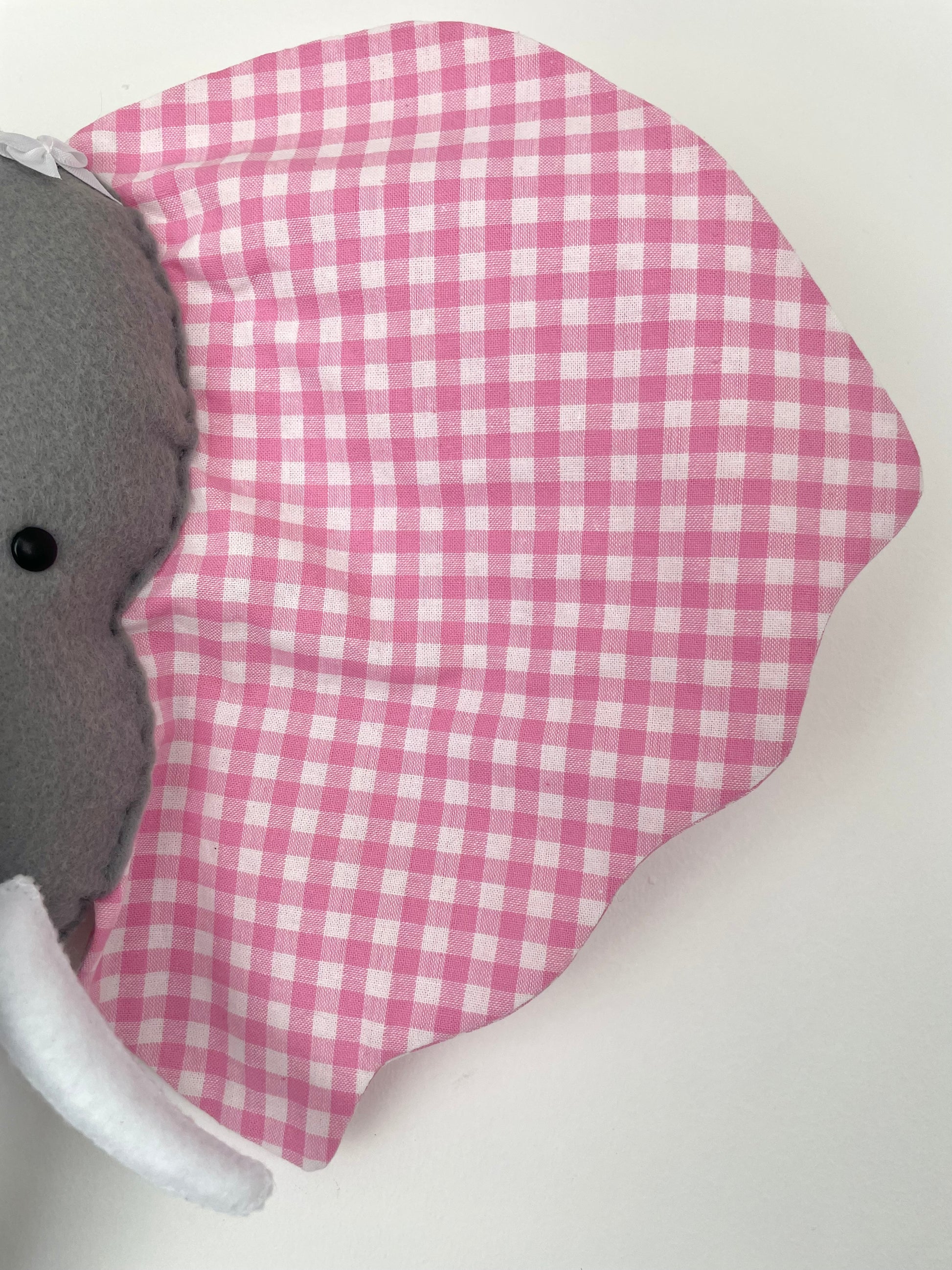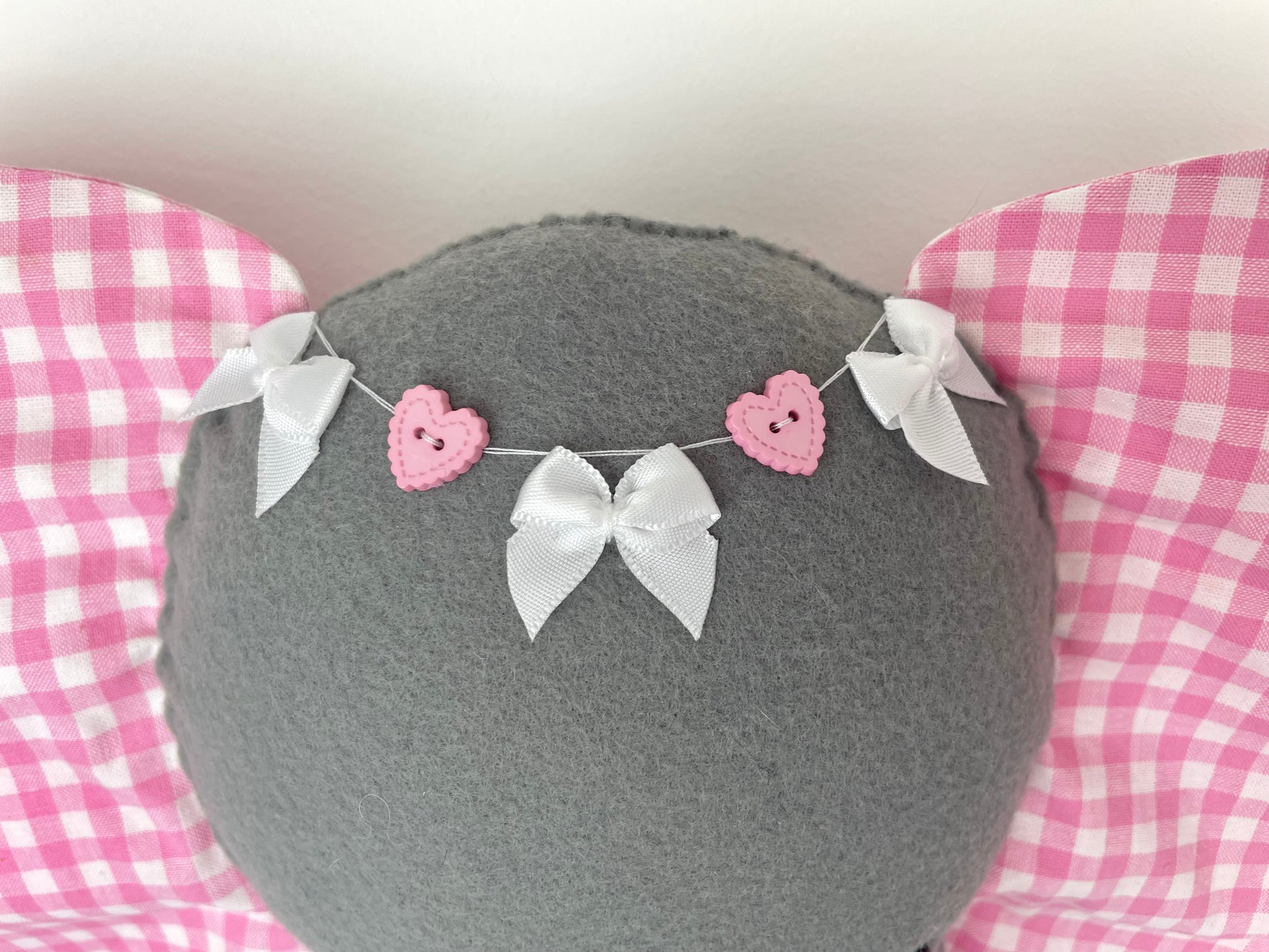Tête en feutrine et oreilles en tissu coton oeko-tex imprimé vichy rose. Ornement en perles et rubans noeud. Rembourrage 100% polyester.